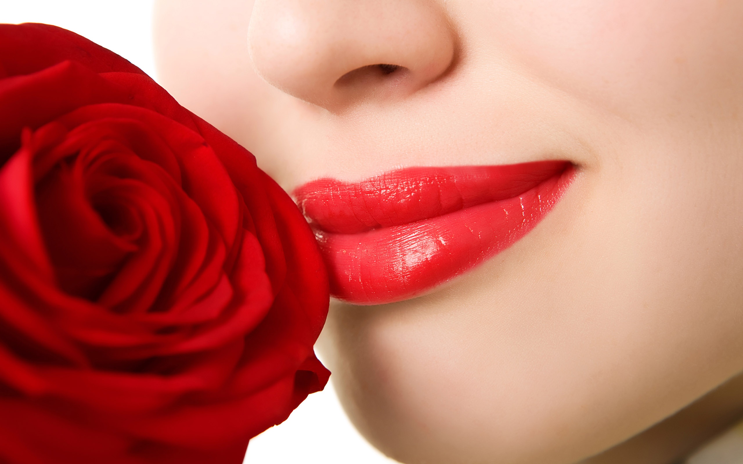 Description: A woman with a red rose in her mouth and a white background with a red rose in her mouth.