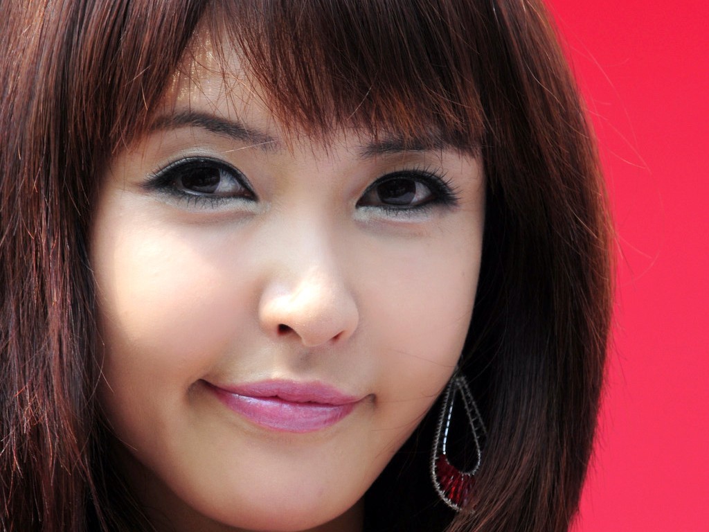 Description: A woman with a red shirt and earrings on her face and a red background with a red wall behind her.