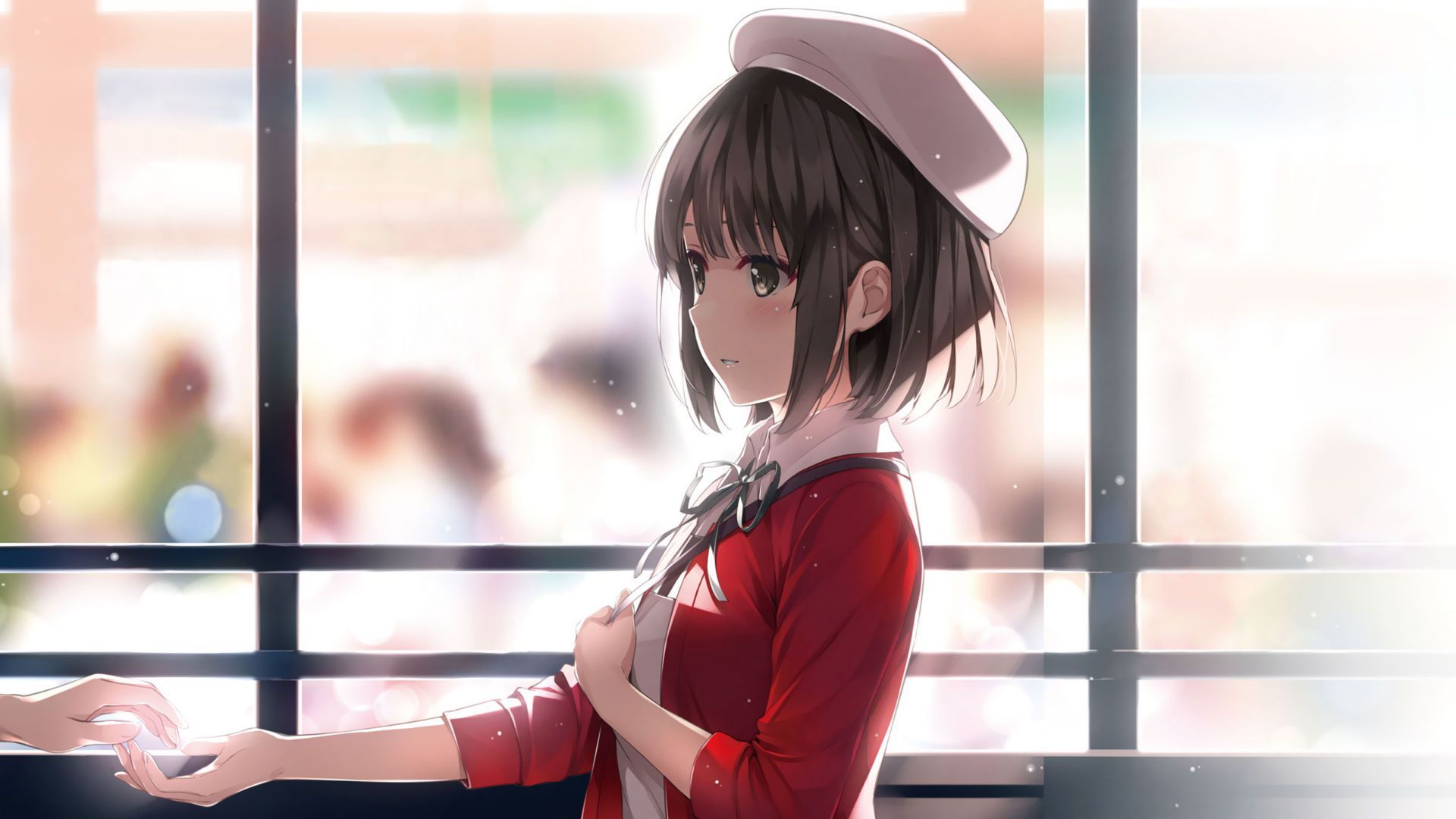 Description: A woman in a red shirt and hat standing in front of a window with a hand on her hip.