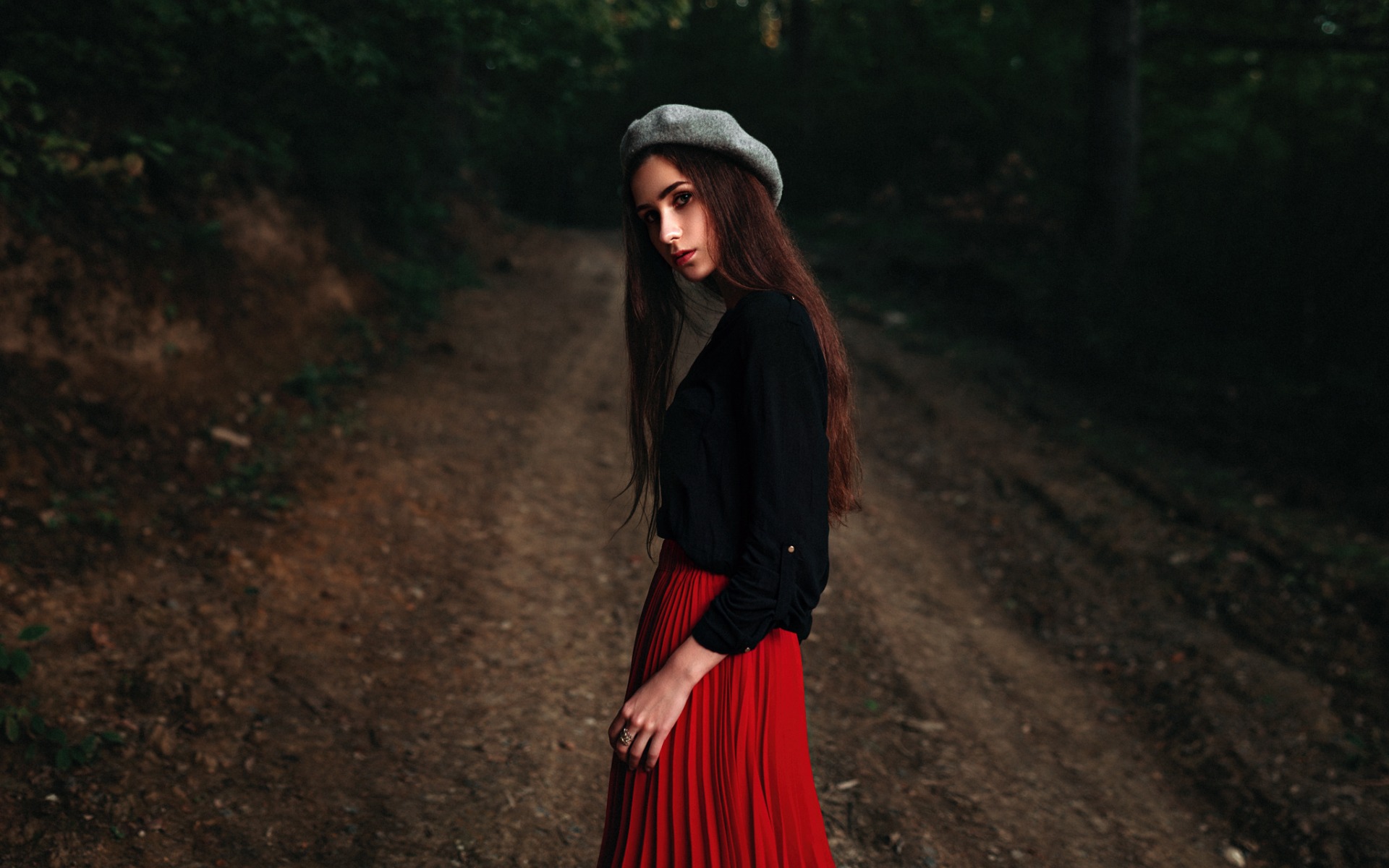 Description: A woman in a red pleated skirt and a hat standing on a dirt road in the woods with a forest behind her.
