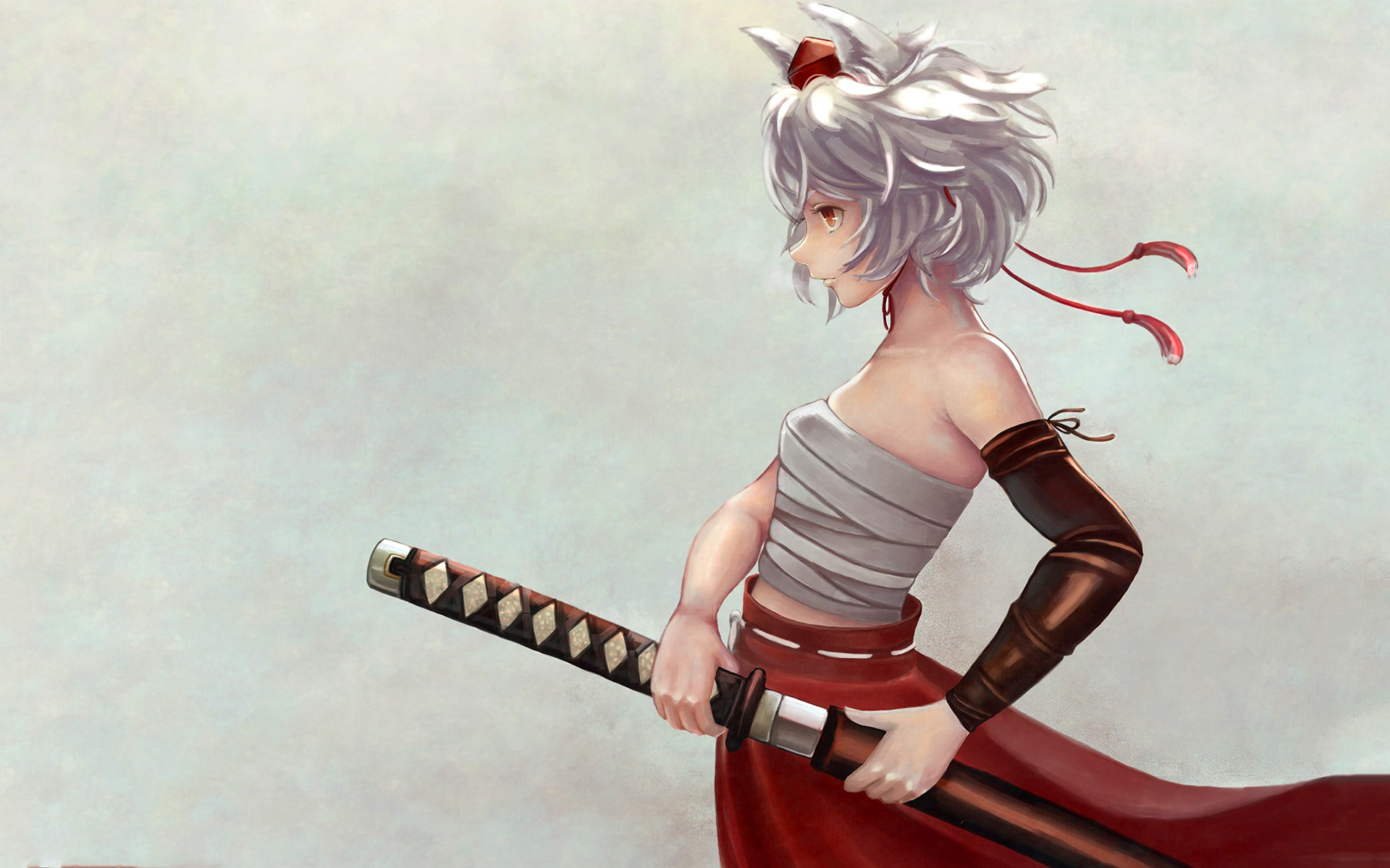 Description: A woman in a red skirt holding a sword and a sword blade in her hand.