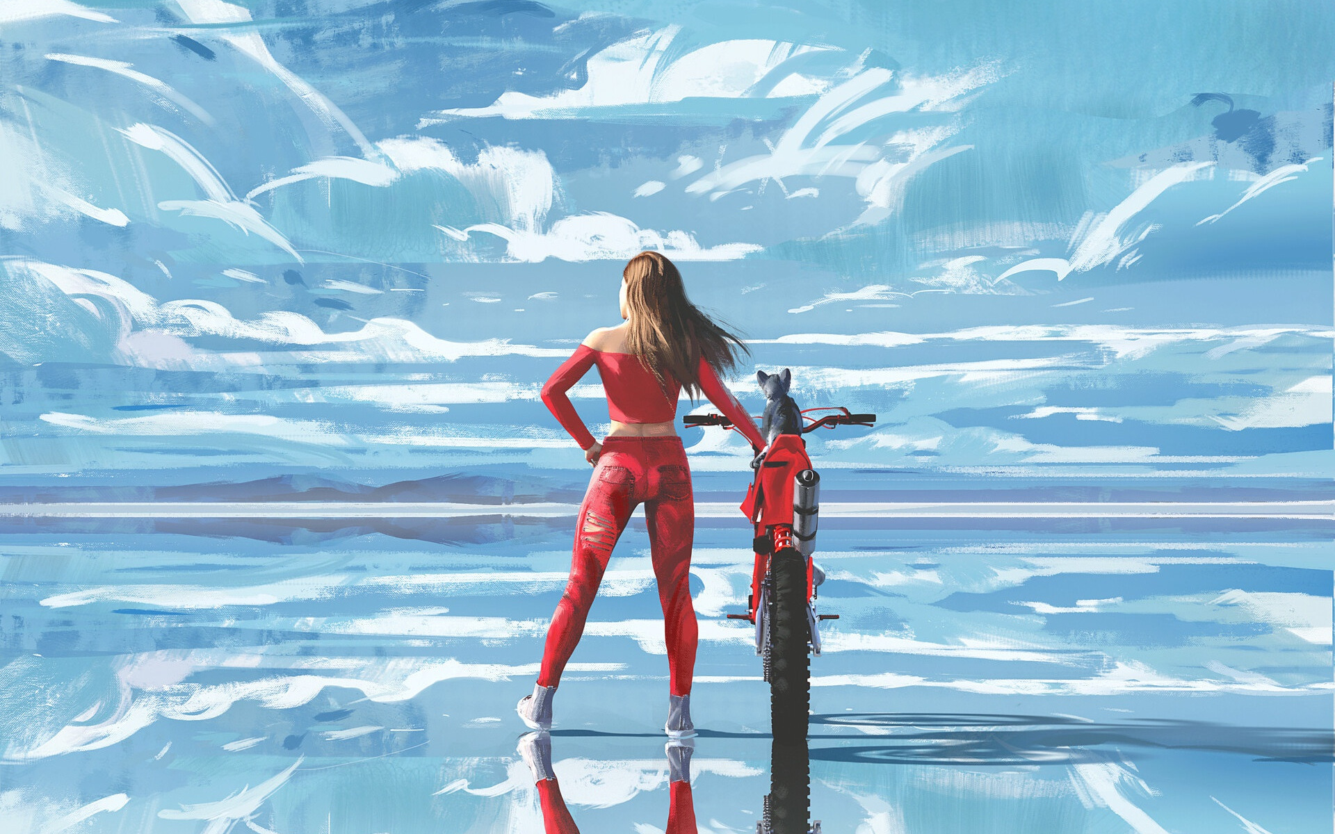 Description: A woman in a red suit standing next to a bike on a beach with a sky background and clouds.