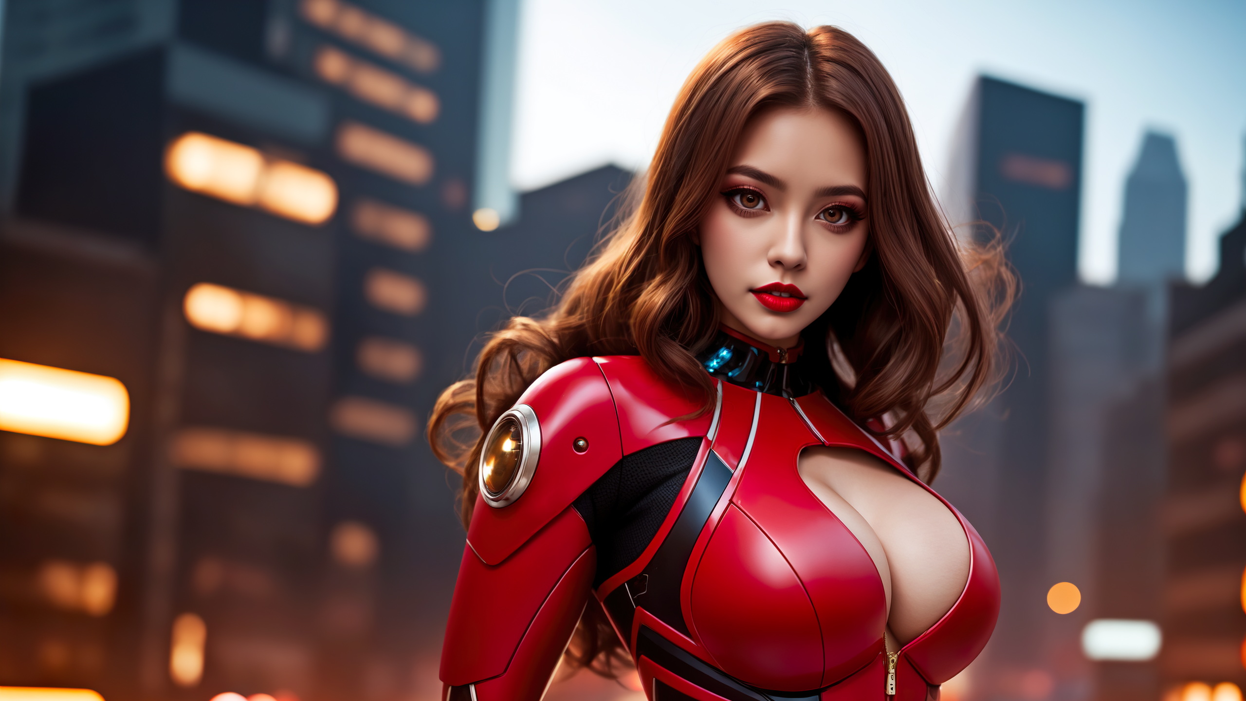 Description: A woman in a red suit with a red helmet and a red glove on her chest and a city skyline in the background.