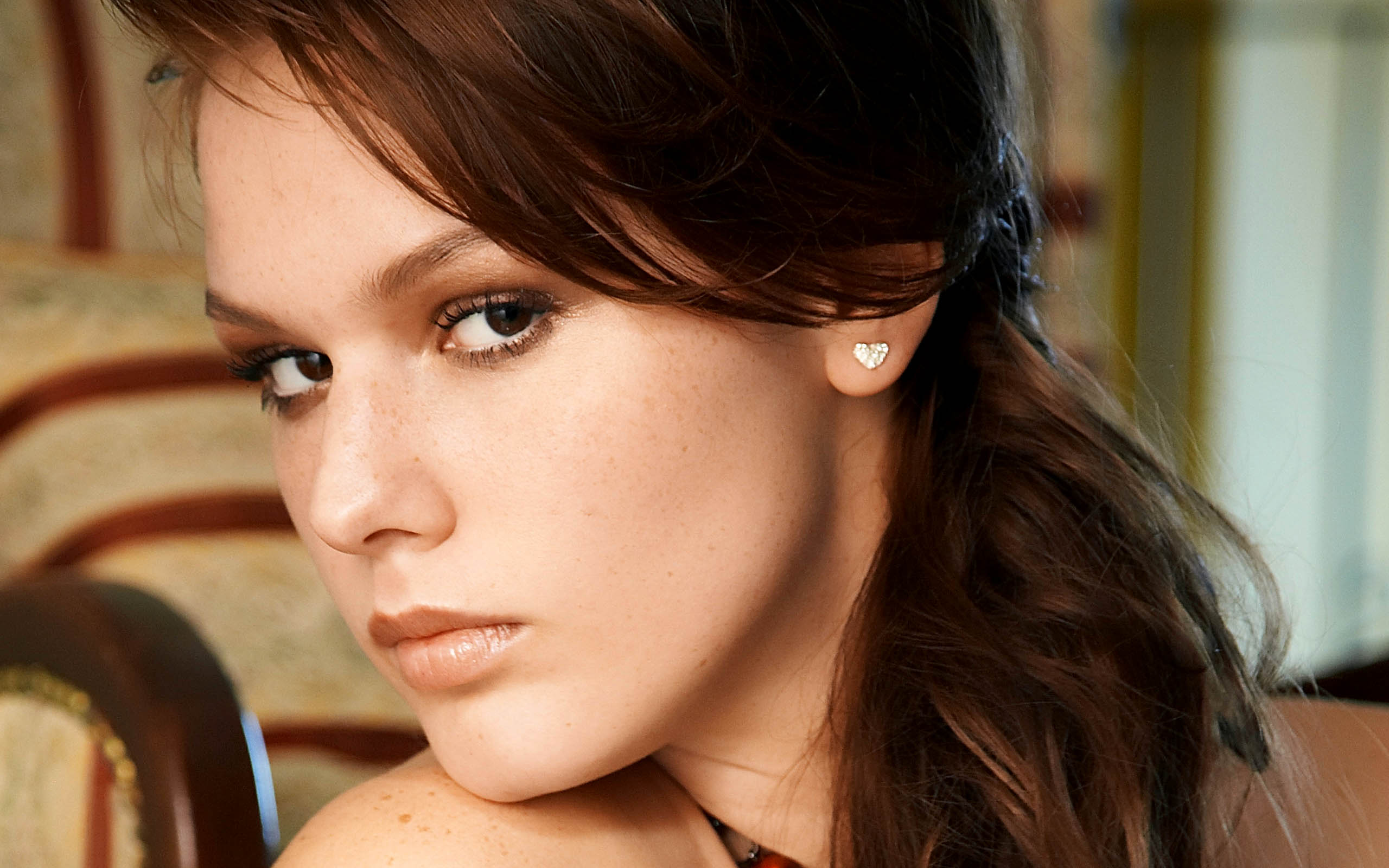 Description: A woman with a red tie and a white heart on her neck and a brown chair behind her and a chair behind her.