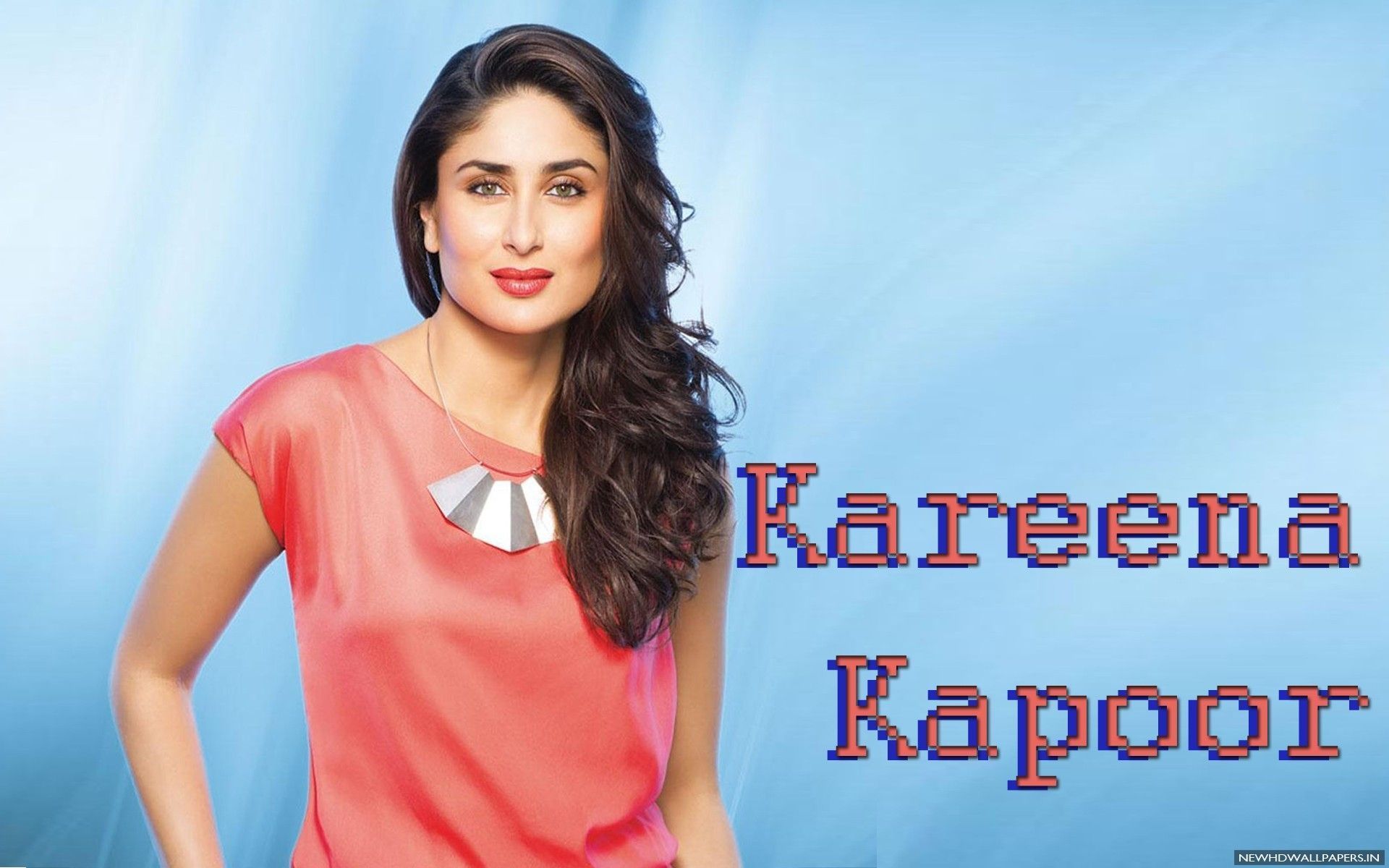 Description: A woman in a red top is posing for a picture with a blue background and the words kareena kapoo.