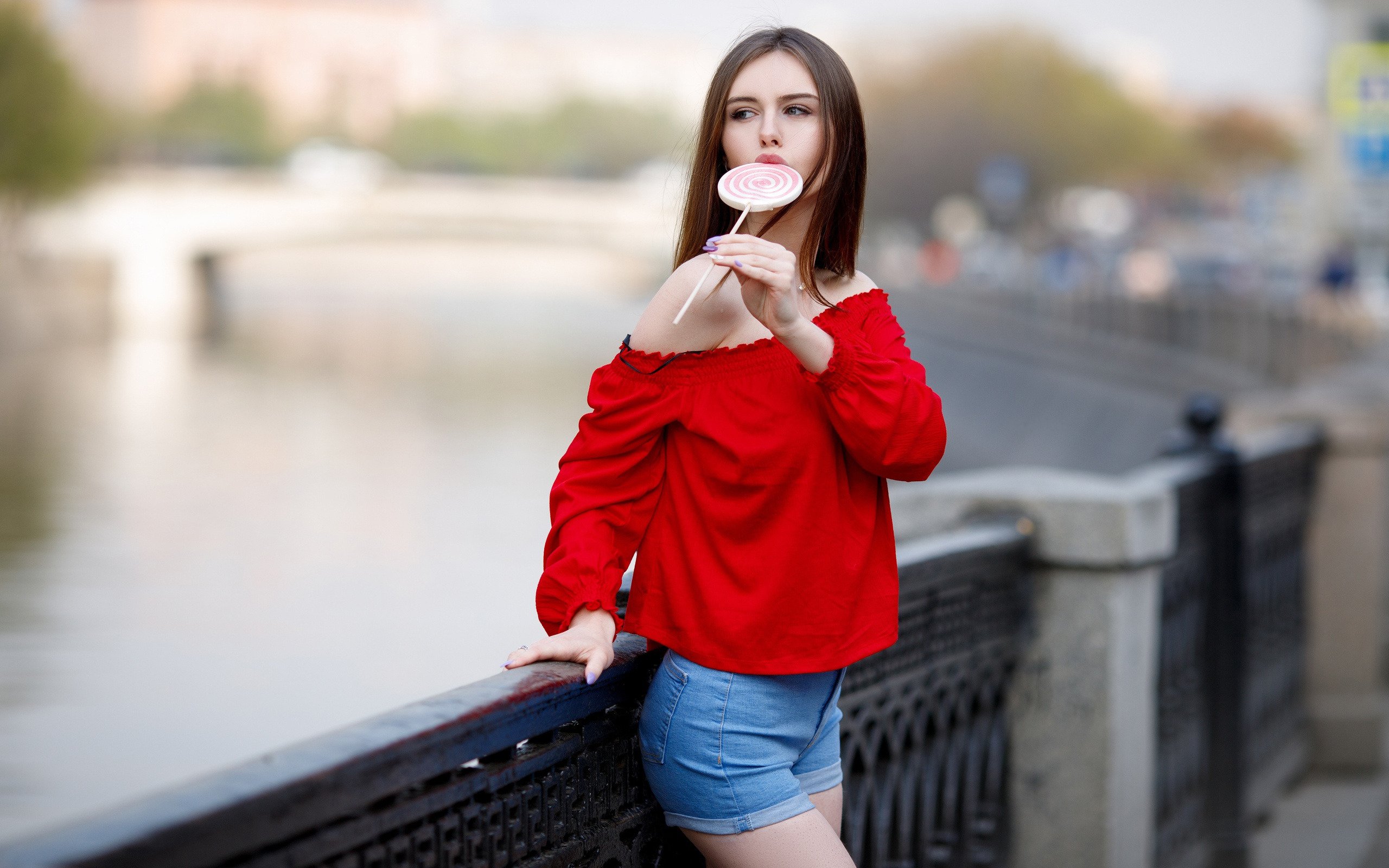 Description: A woman in a red top is holding a white object in her hand and standing on a bridge over a river.