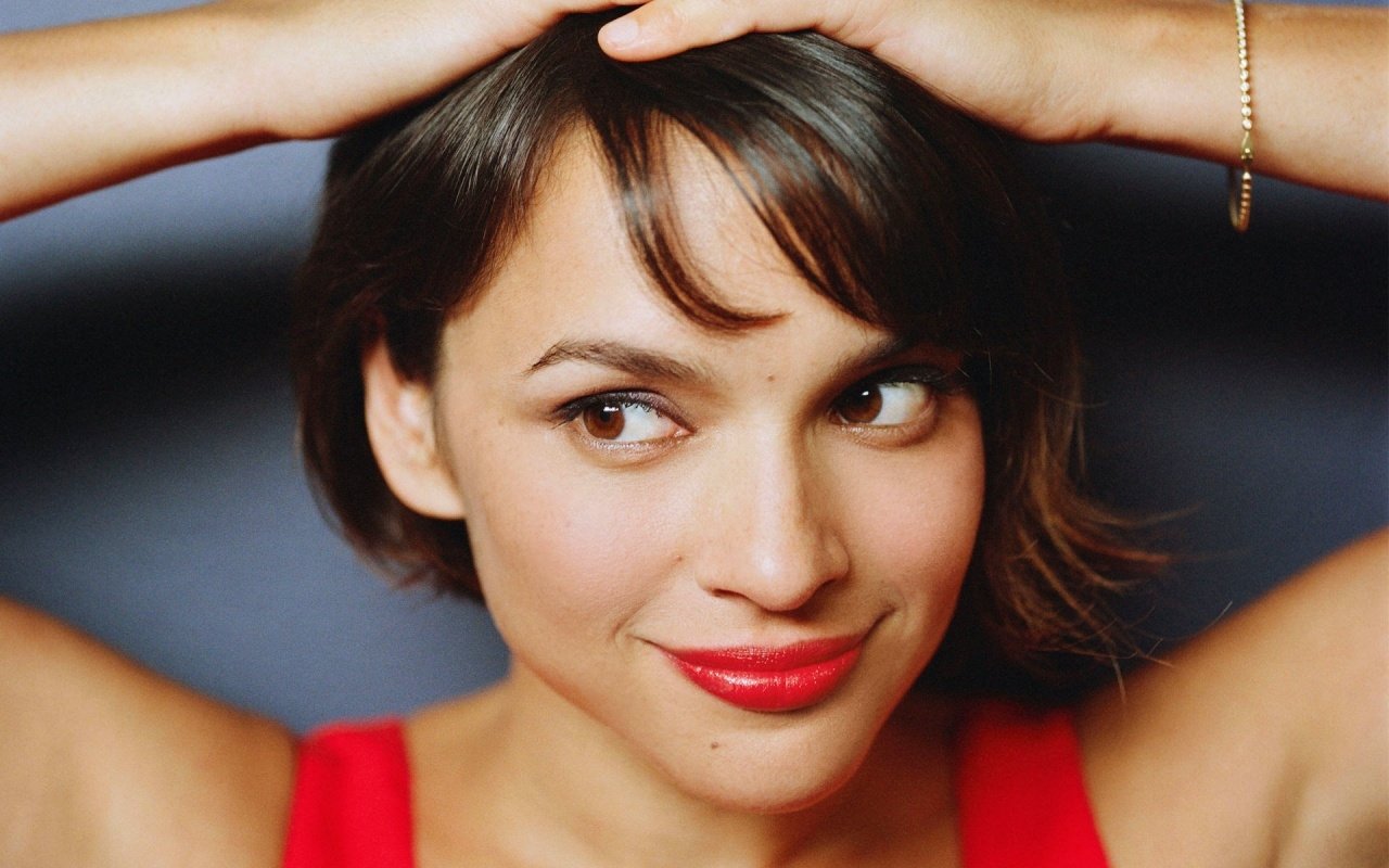 Description: A woman with a red top and a necklace on her head and her hands on her head and her eyes open.