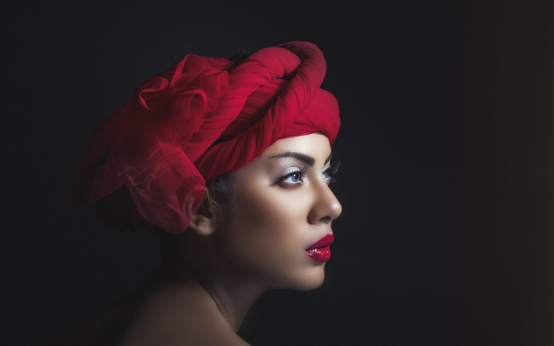 Description: A woman with a red turban on her head and a red lipstick on her lips.