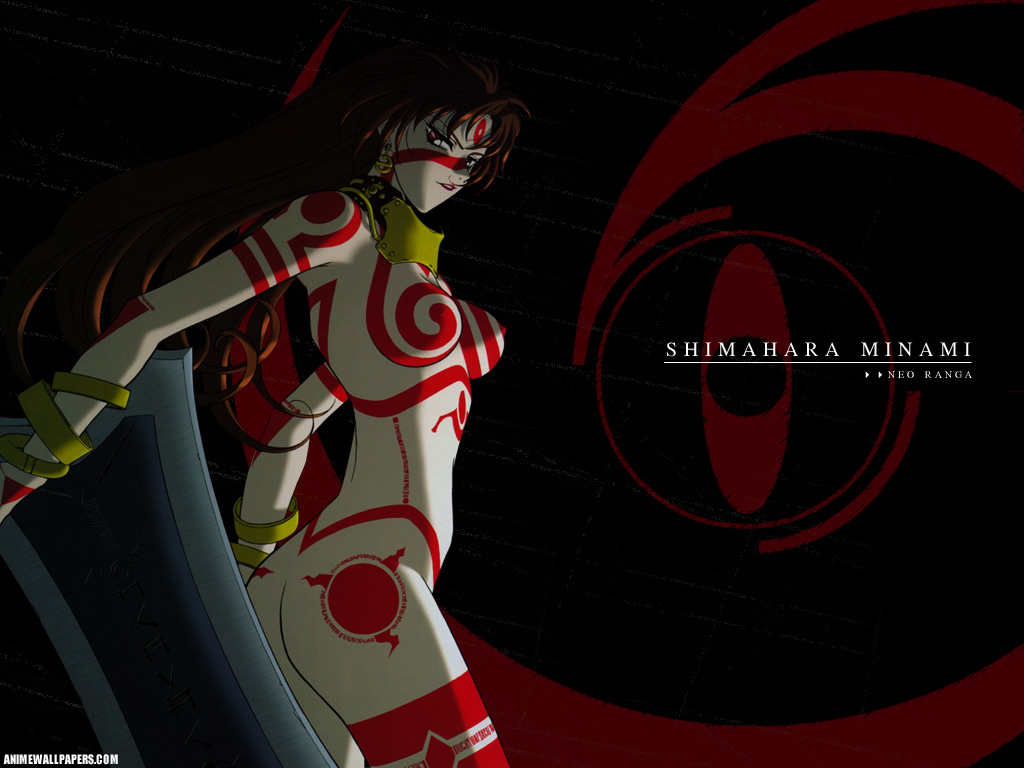 Description: A woman in a red and white dress holding a sword and a sword case in front of a black background.