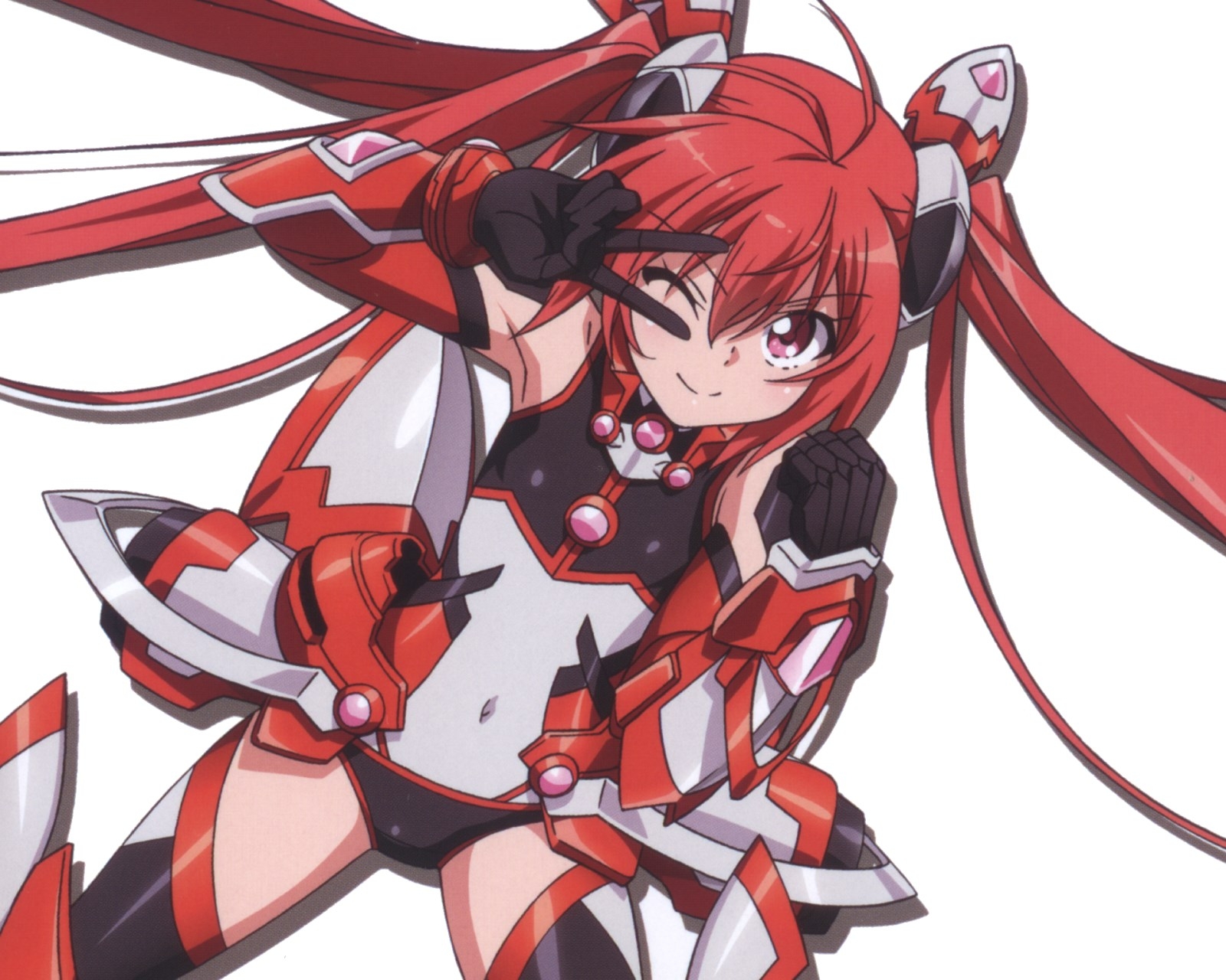 Description: A woman in a red and white outfit with long red hair and a black and white outfit with a red and white design.