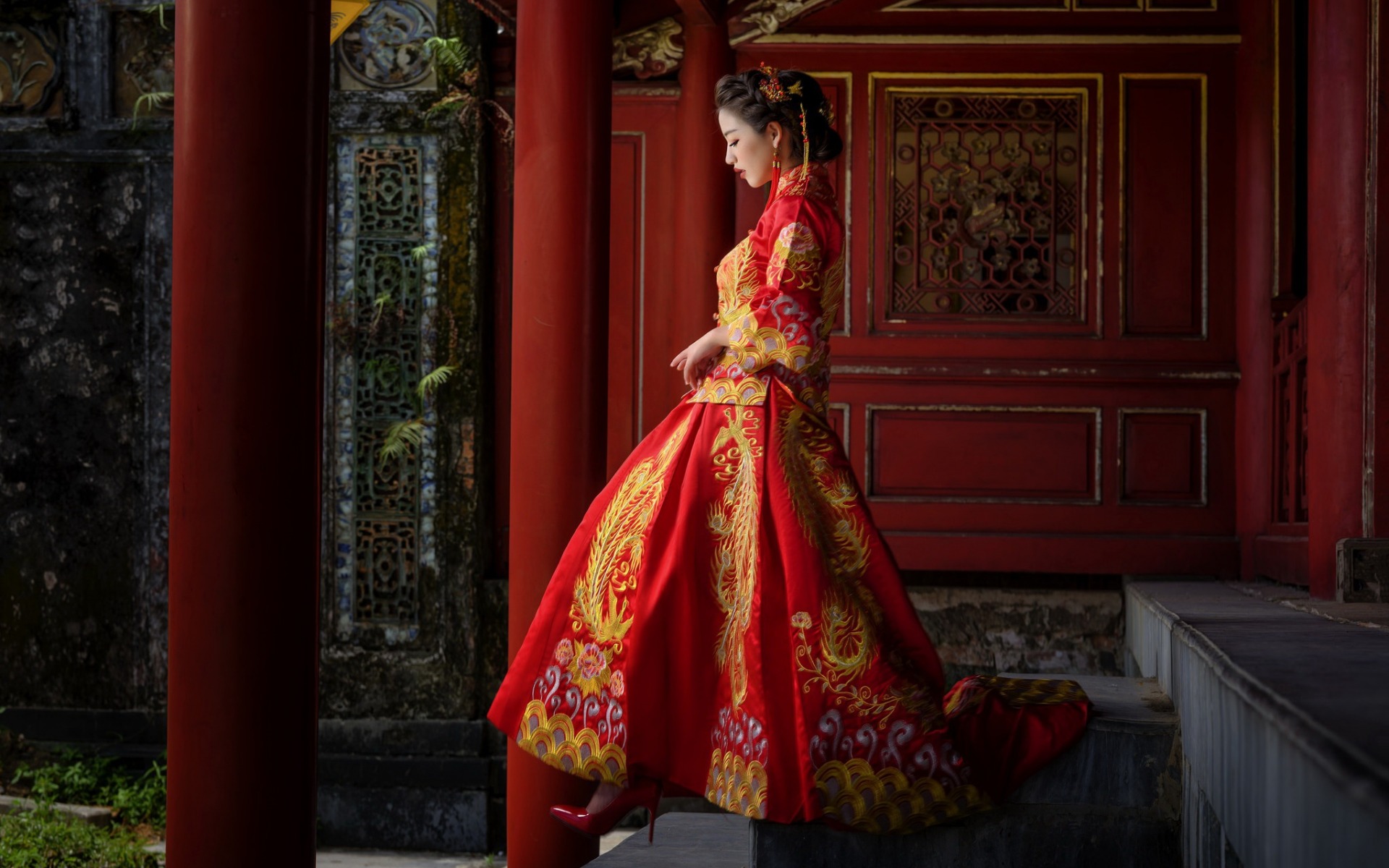 Description: A woman in a red and yellow dress standing in front of a red building with columns and columns in the background.