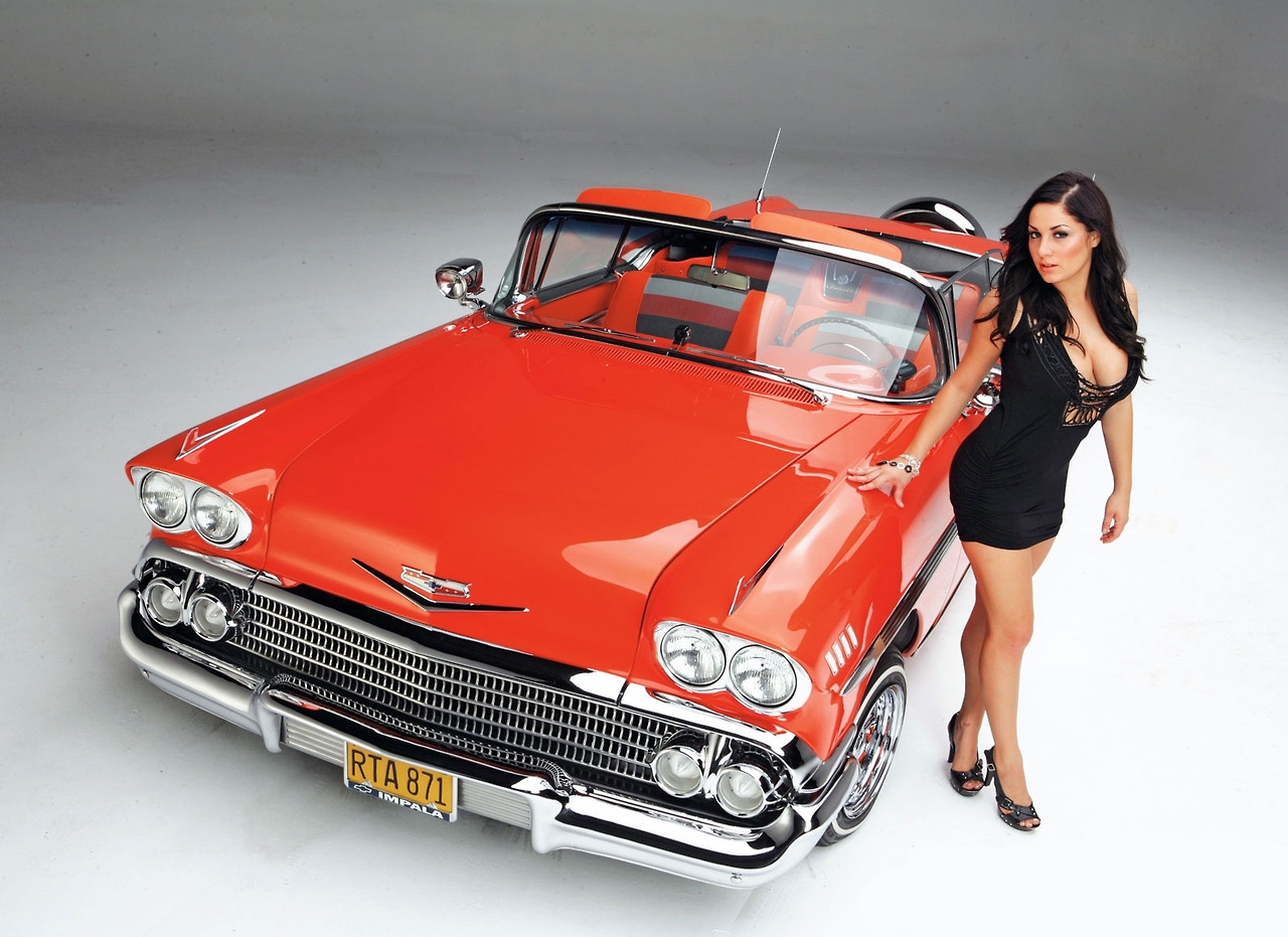 Description: A woman in a short dress leaning on a red car with a hood up and a license plate on it.