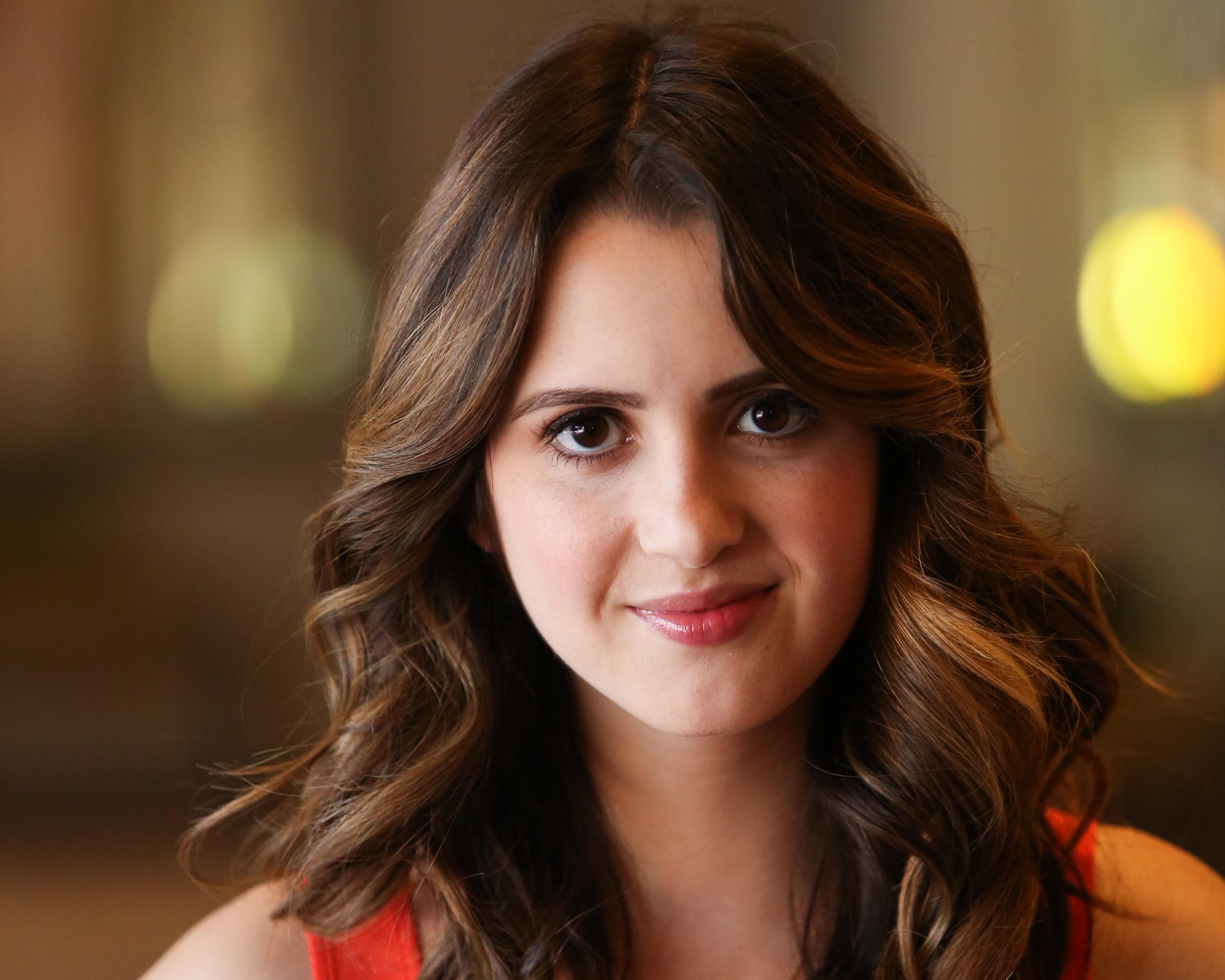 Description: A woman with long hair wearing a red dress and smiling at the camera with a blurry background of lights.