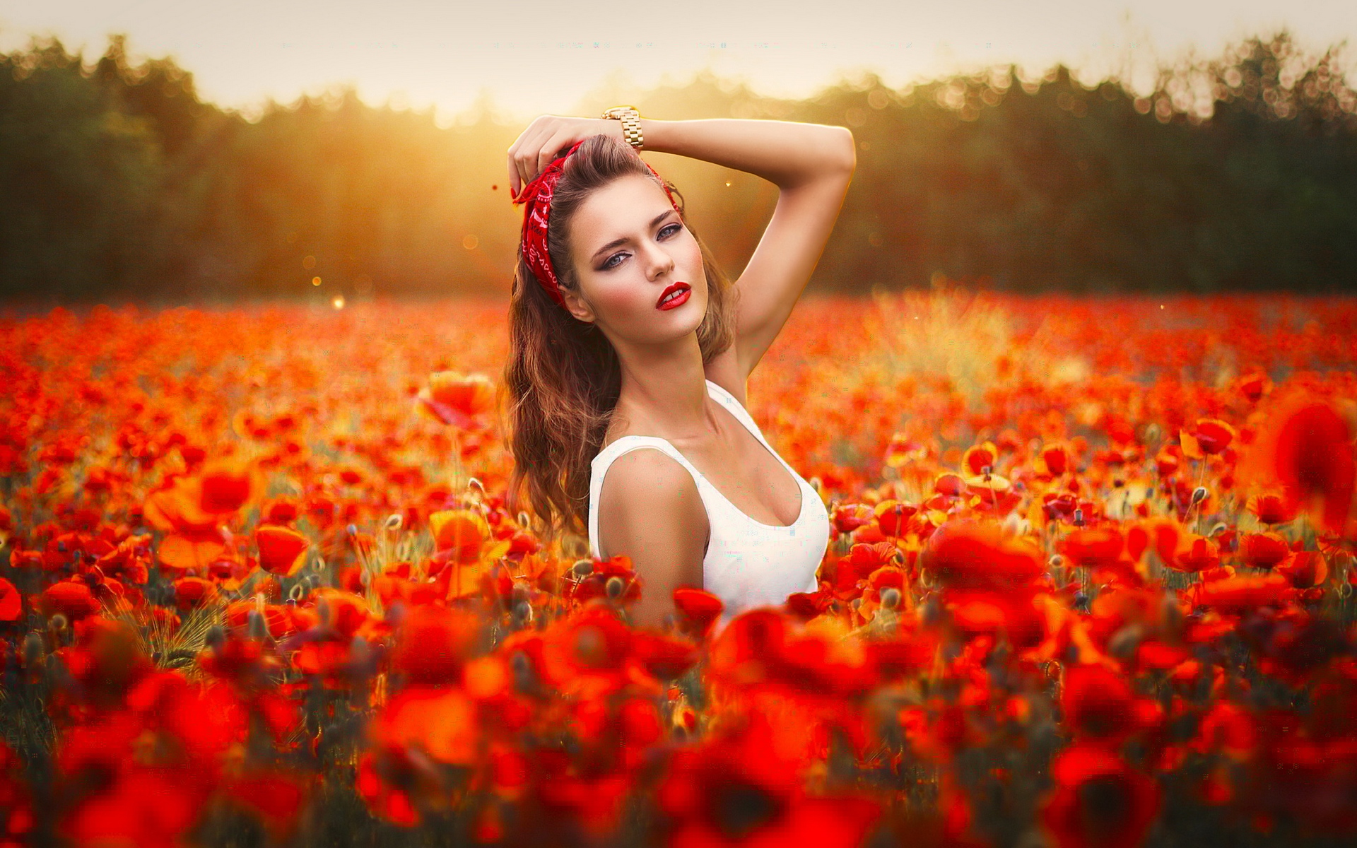 Description: A woman in a field of red flowers with her hair in a bunt and a red flower in her hair.