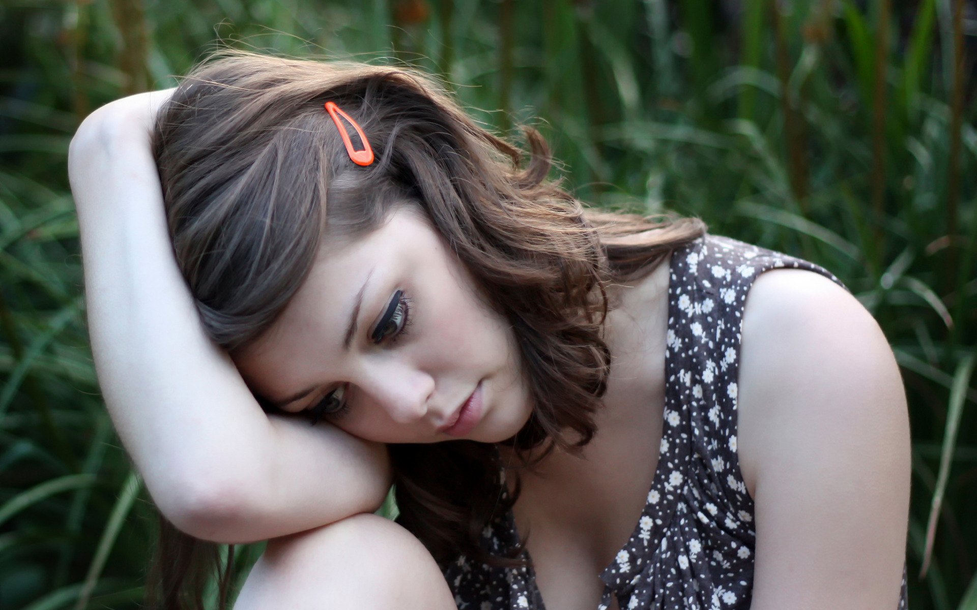 Description: A woman with a red hair clip sitting in front of a plant and grass area with her hands on her head.