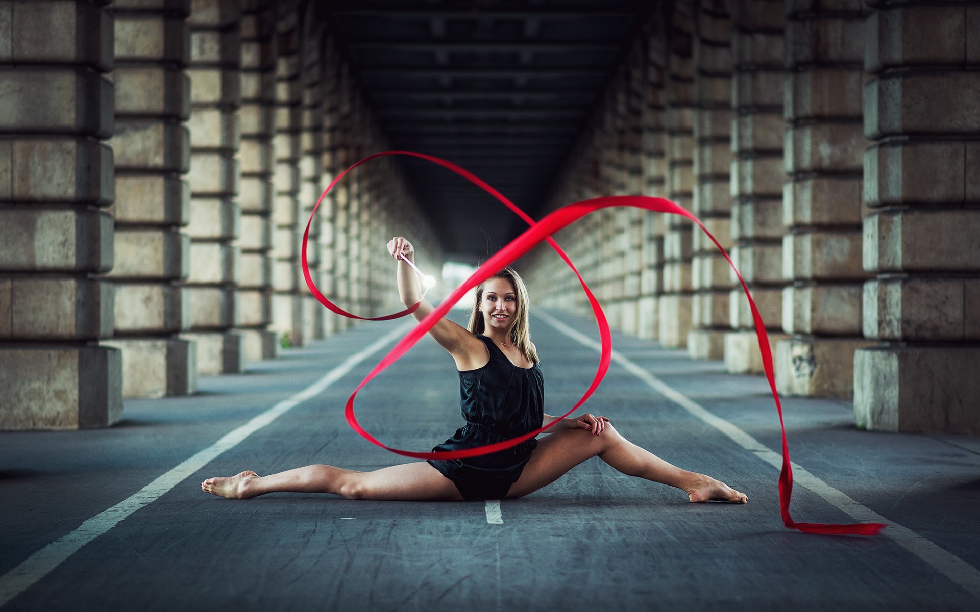 Description: A woman sitting on the ground with a red ribbon in her hand and a red ribbon in the air.