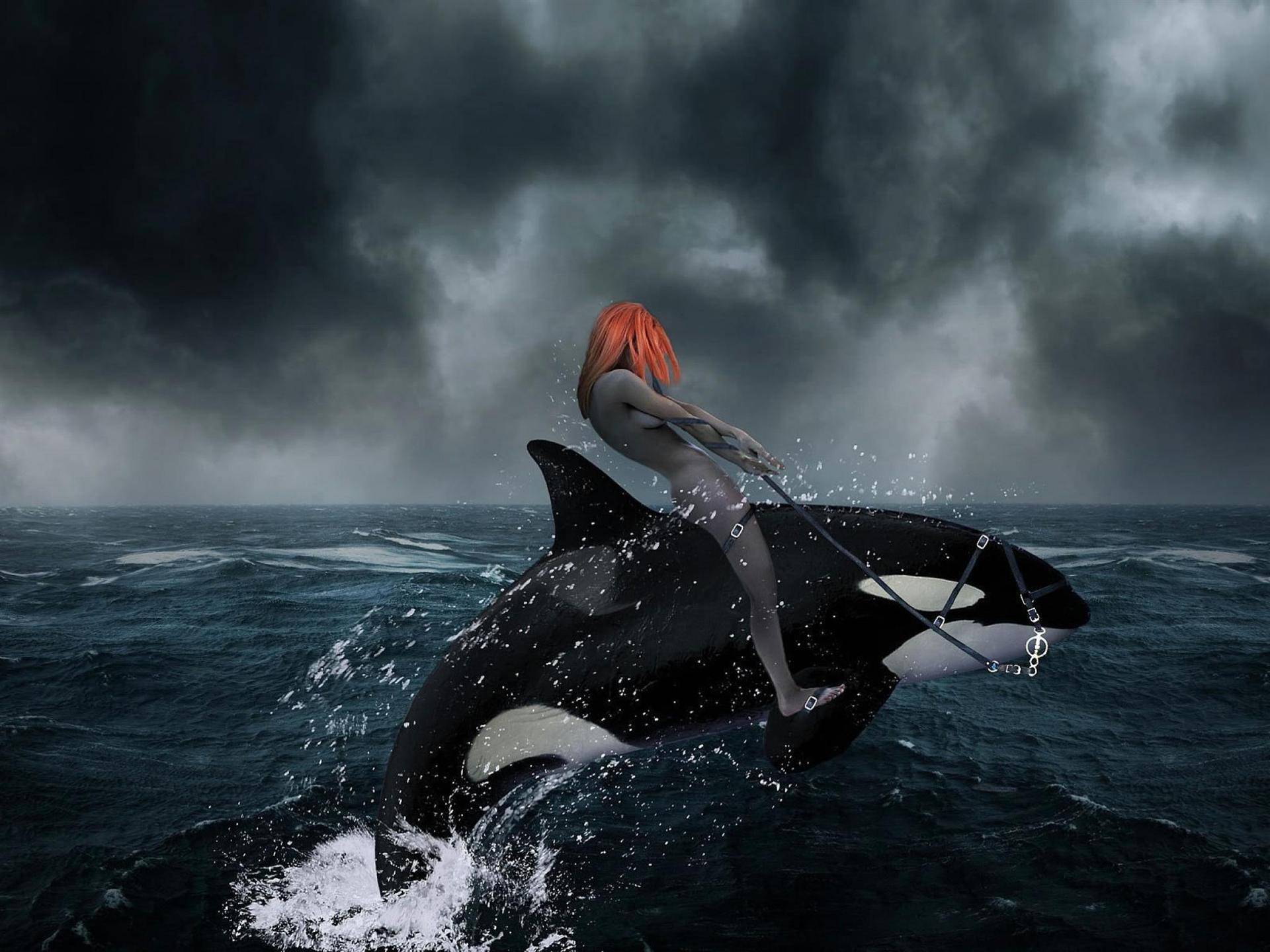 Description: A woman riding a whale in the ocean on a cloudy day with a red hair and a black and white outfit.