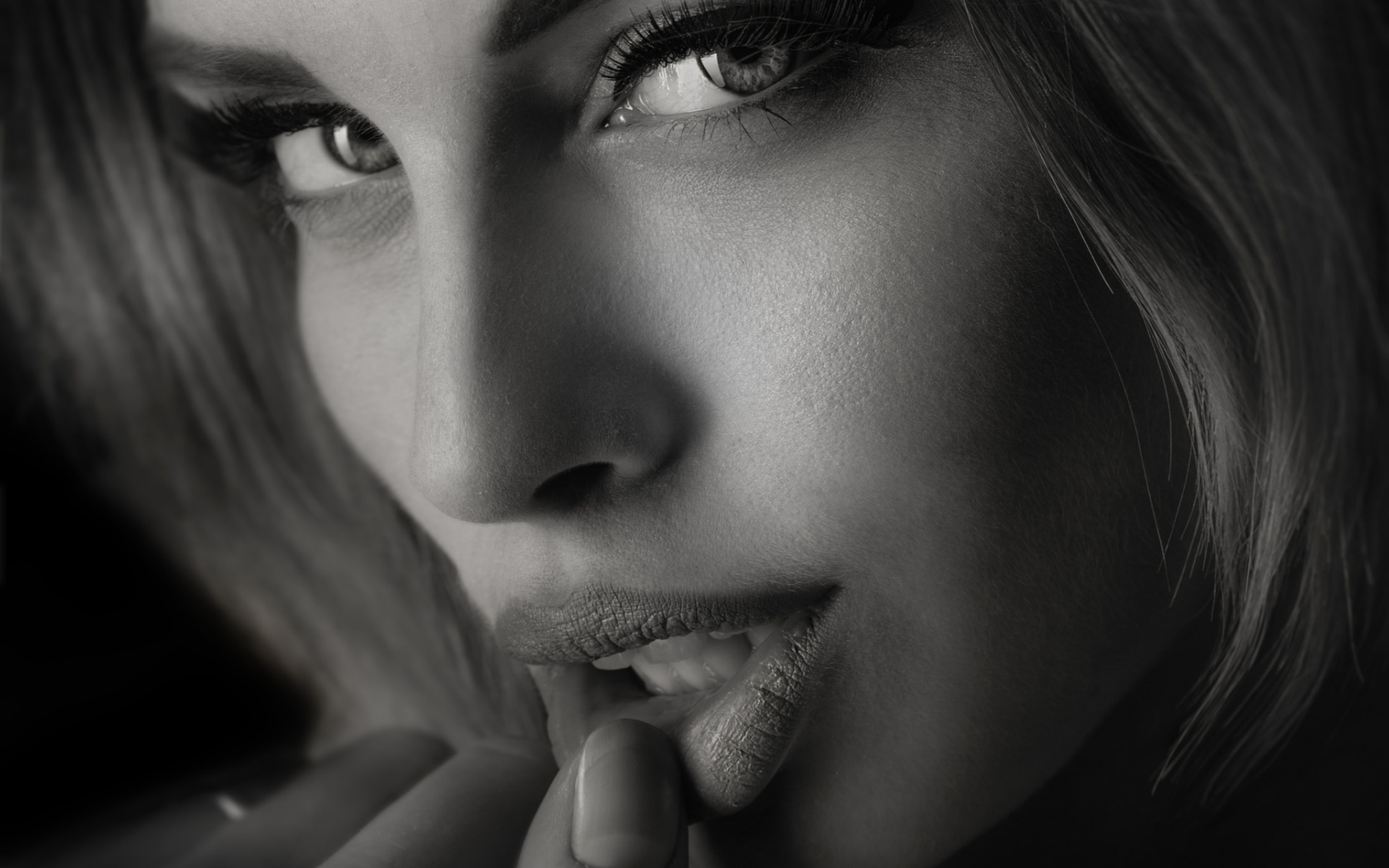 Description: A woman with a ring on her finger is posing for a picture in black and white with a dark background.