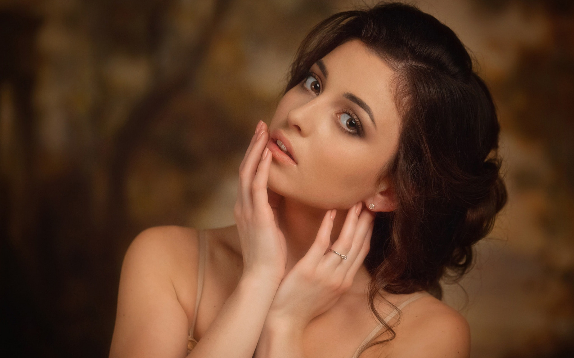 Description: A woman with a ring on her finger posing for a picture in a photo studio with a tree background.
