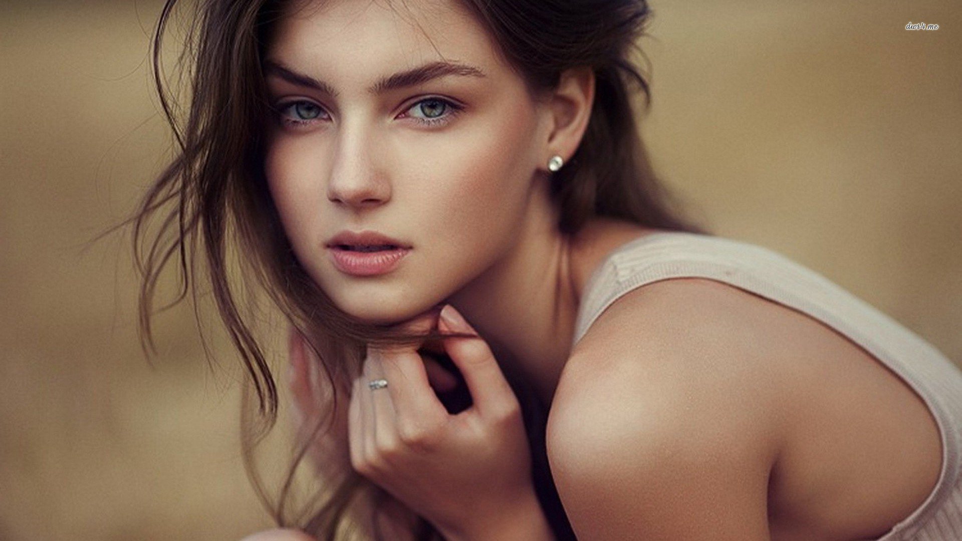 Description: A woman with a ring on her finger posing for a picture with a brown background and a blurry background.