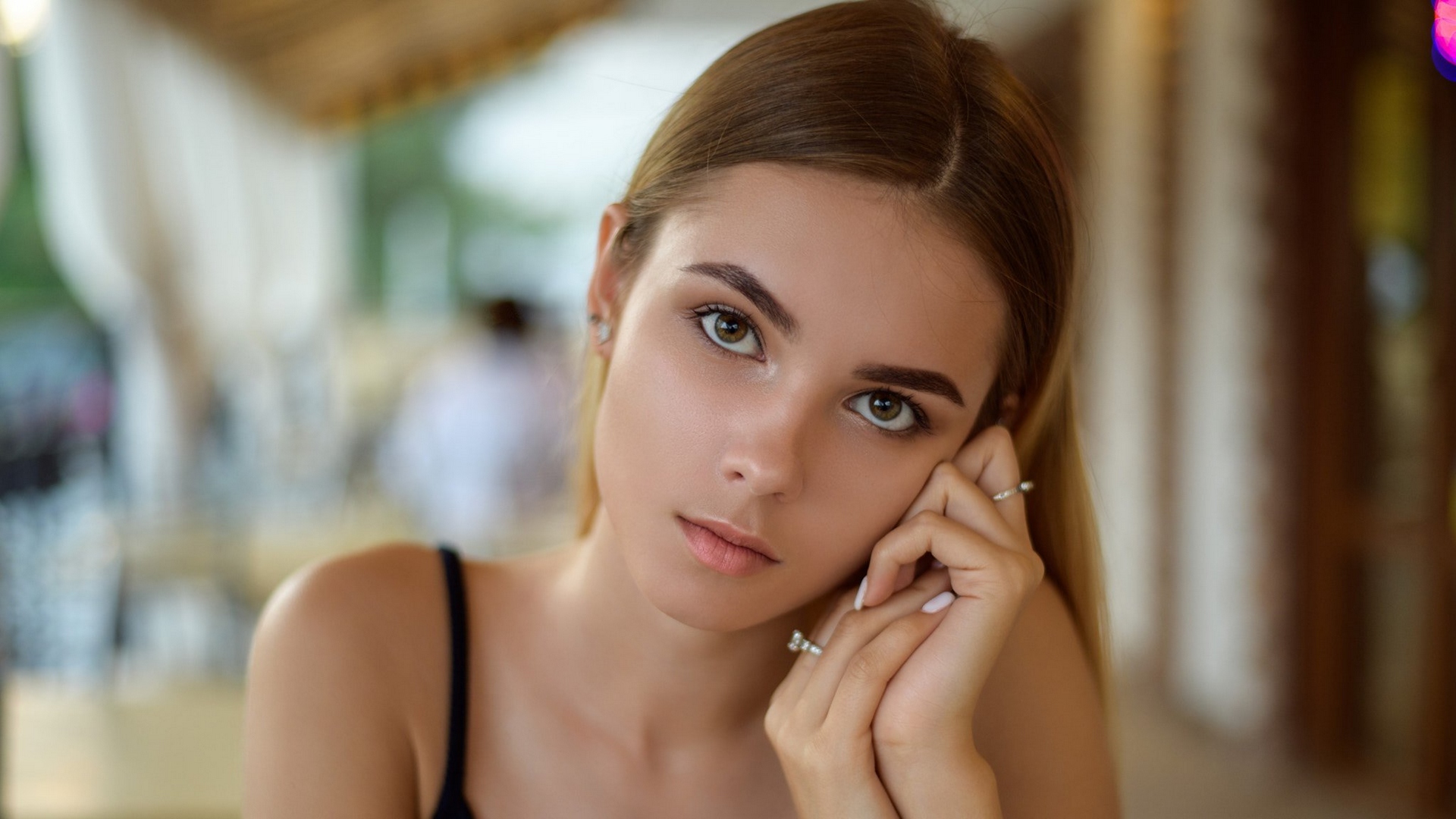 Description: A woman with a ring on her finger posing for a picture with a blurry background of a restaurant.