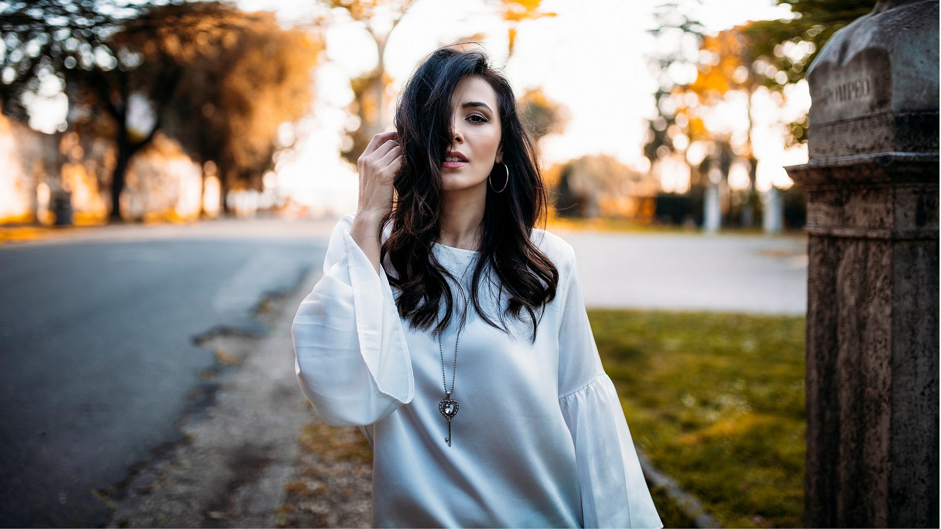 Description: A woman standing on the side of a road next to a tree filled street with a traffic light in the background.