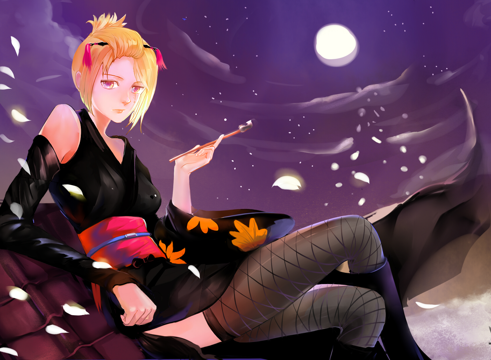Description: A woman sitting on a rock smoking a cigarette in the night sky with a full moon behind her and a purple sky with stars.