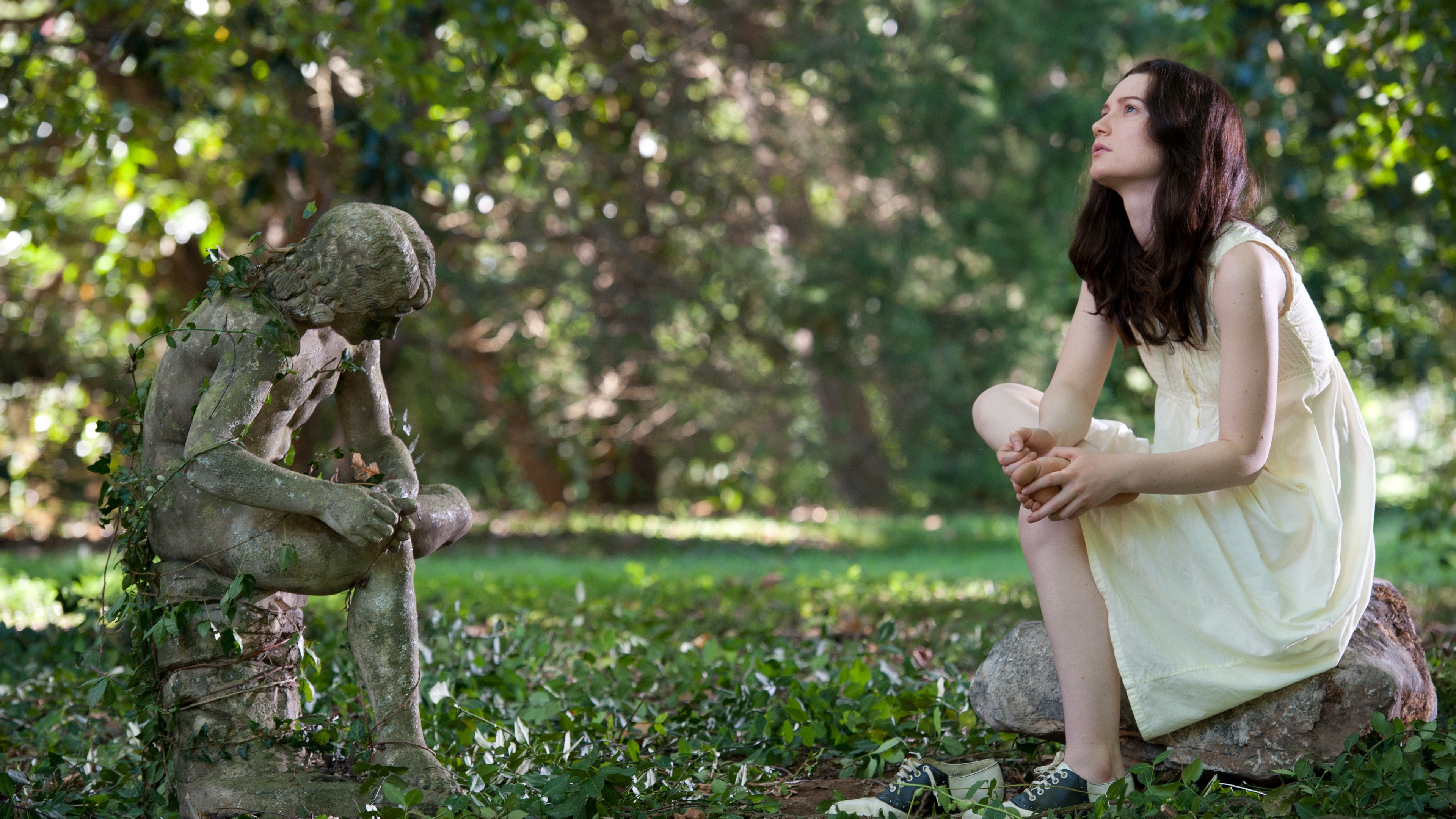 Description: A woman sitting on a rock next to a statue of a boy and a girl in a park setting.