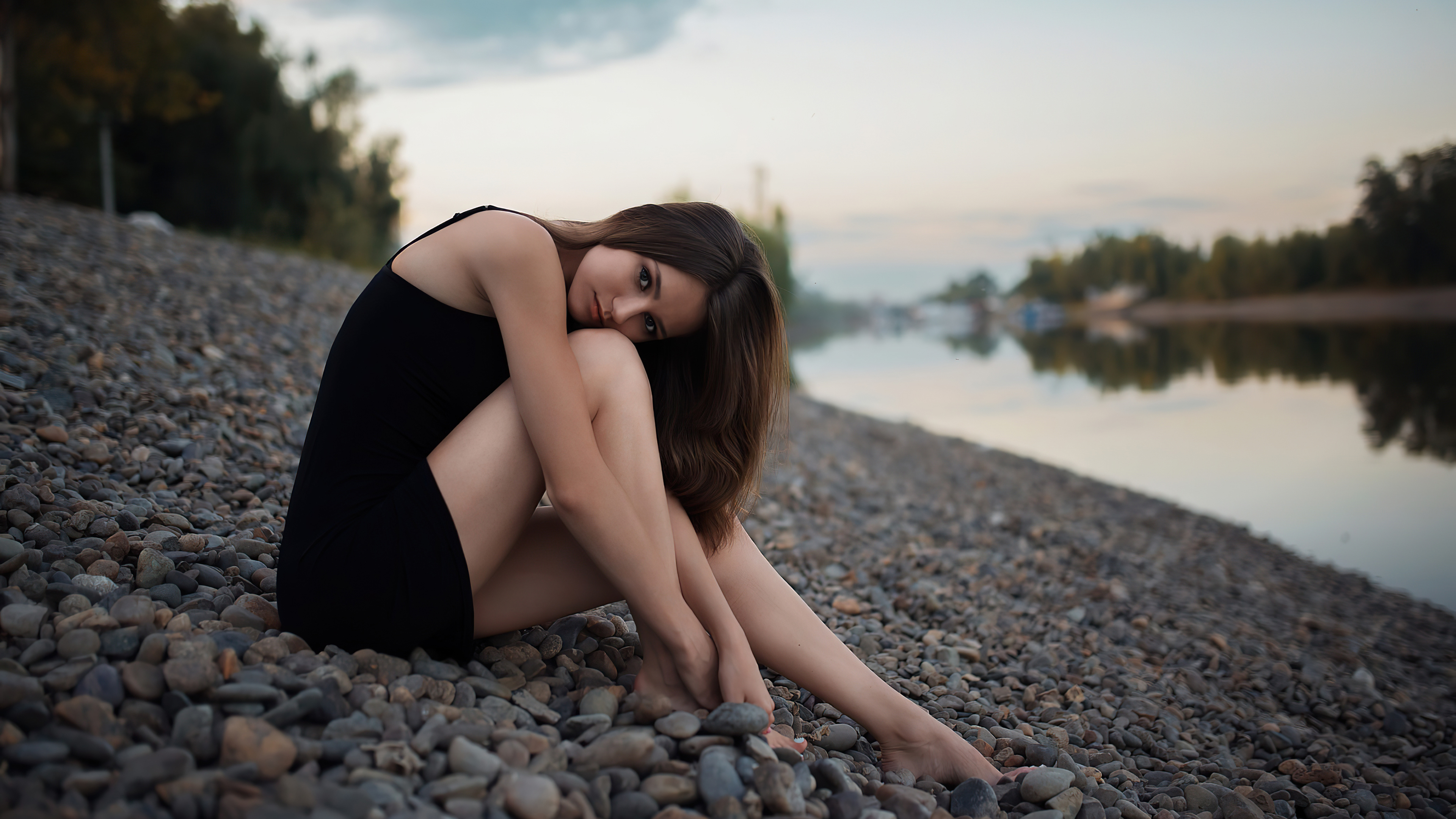 Description: A woman sitting on a rocky beach next to a lake with her legs crossed and her head resting on her hand.