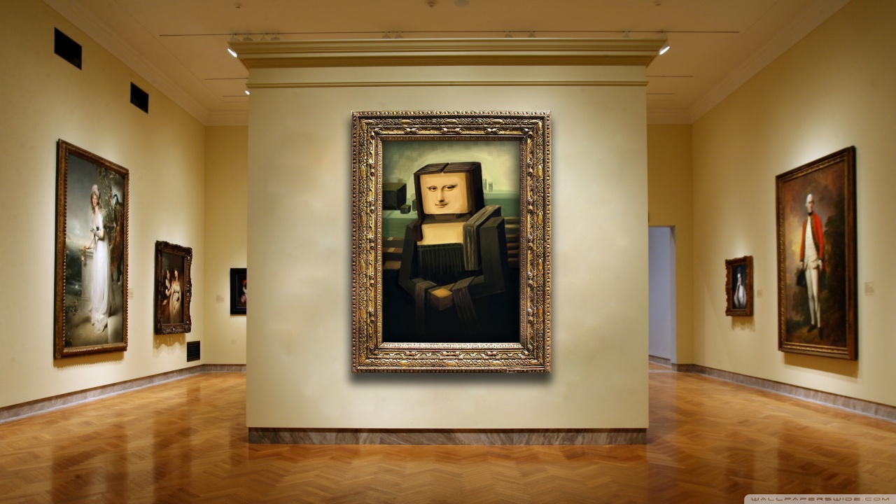 Description: A painting of a woman in a room with other paintings on the wall and a wooden floor in front of it.