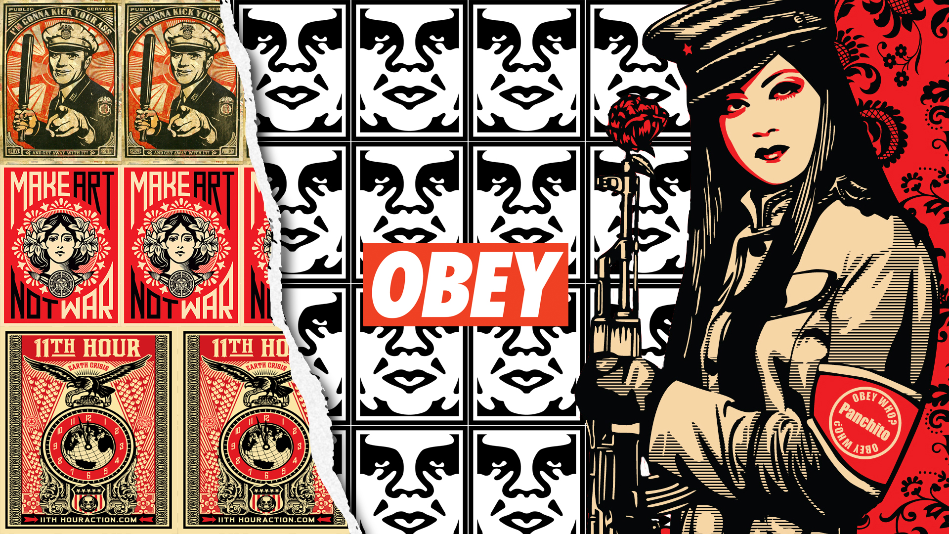 Description: A woman with a rose in her hand and a poster of obey written on it with images of women.