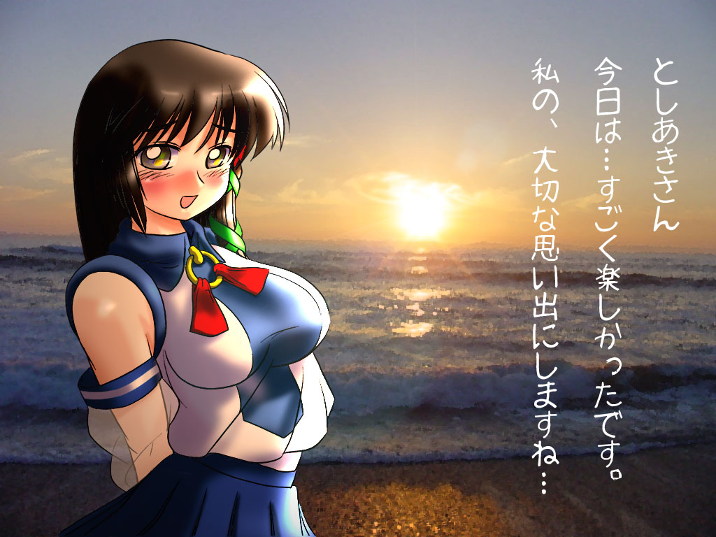 Description: A woman in a sailor outfit standing on a beach at sunset with the sun in the background and a message written in japanese.