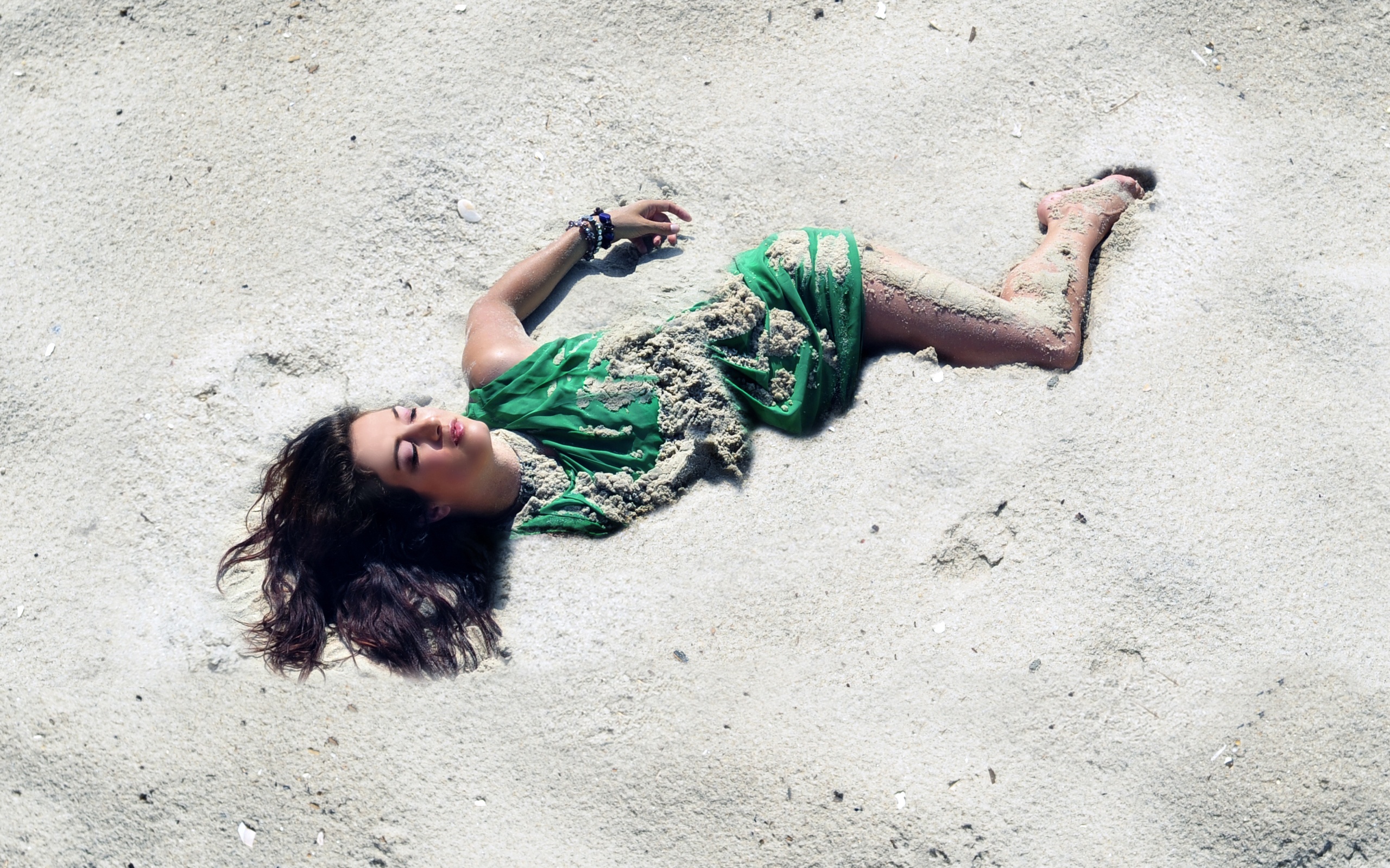 Description: A woman laying on the sand with her feet up in the air and her arms out to her side.