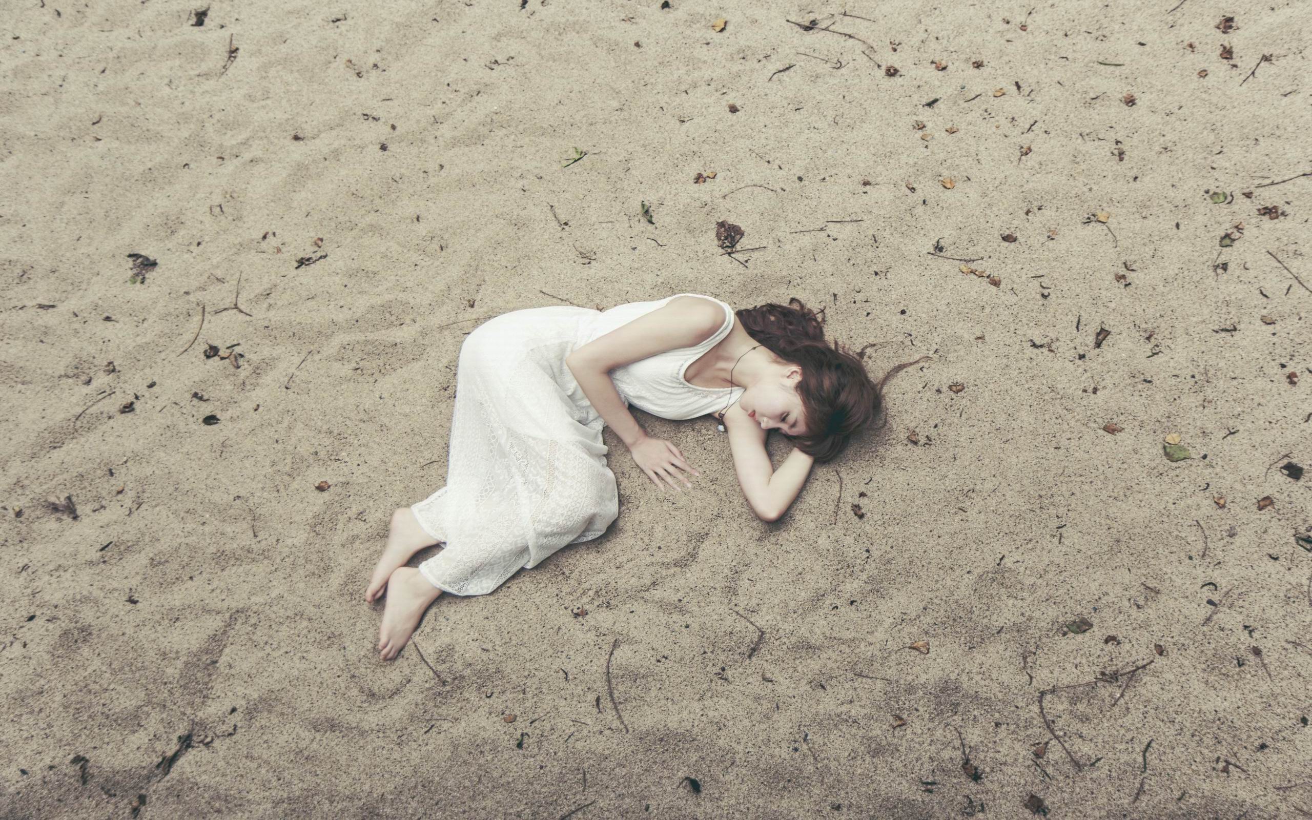 Description: A woman laying on the sand with her head on her hand and her hand on her face.