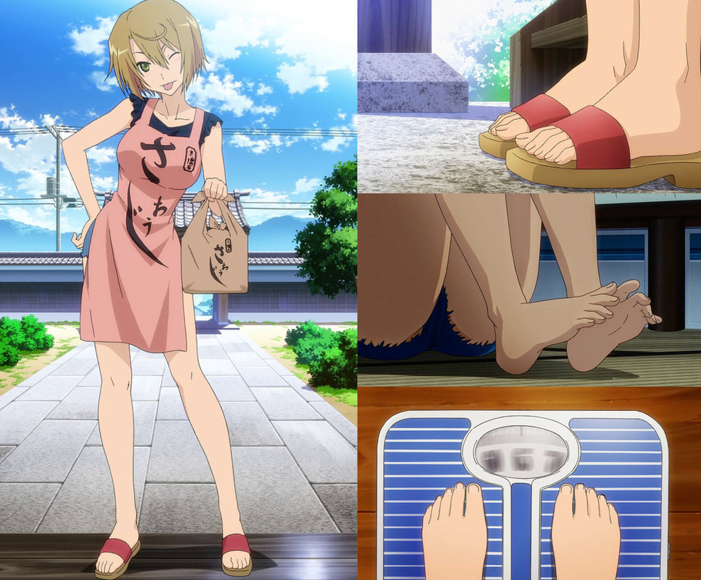 Description: A woman standing on a scale next to a person holding a bag and a scale with a person standing on it.