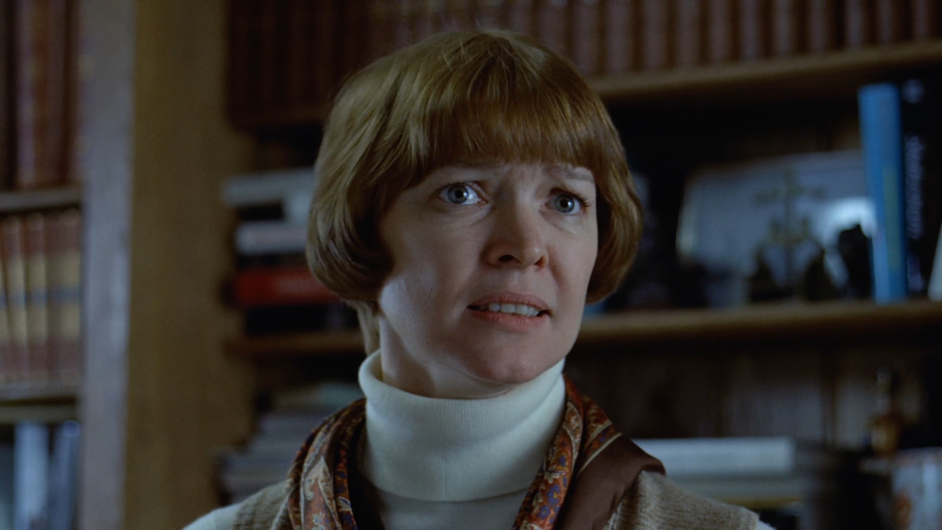 Description: A woman with a scarf around her neck looking at something in the distance with books on the shelves behind her.