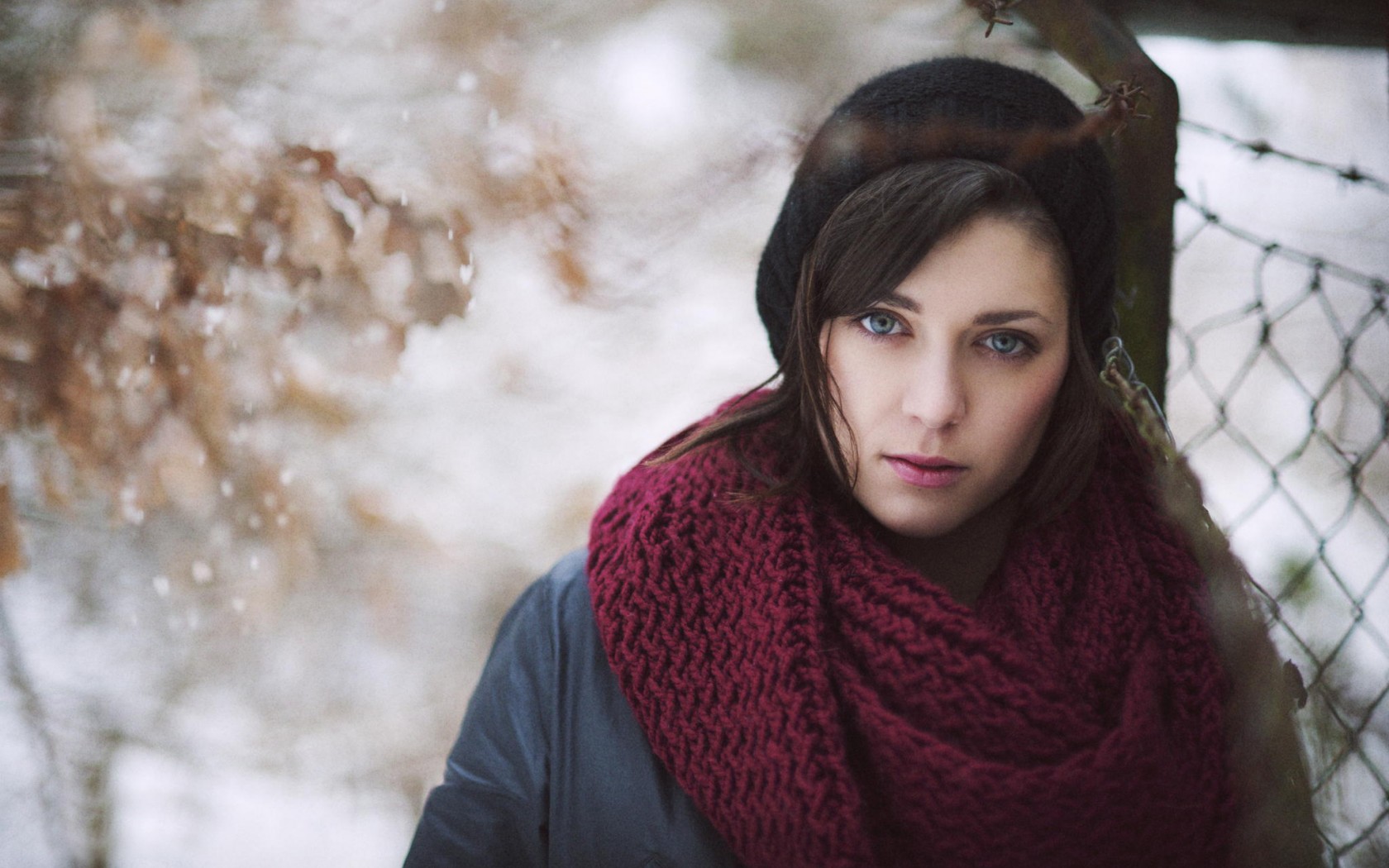 Description: A woman wearing a scarf and a hat standing in the snow near a fence with a tree behind her.