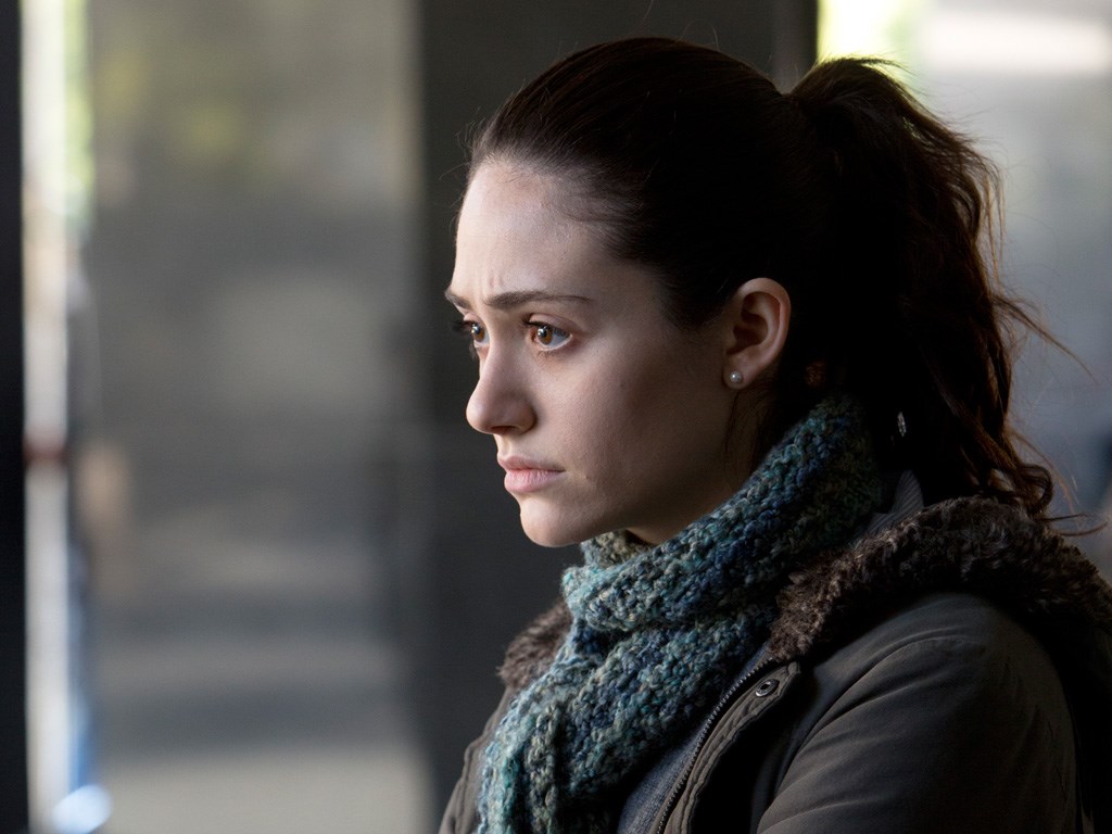 Description: A woman with a scarf around her neck looking off into the distance with a serious look on her face.