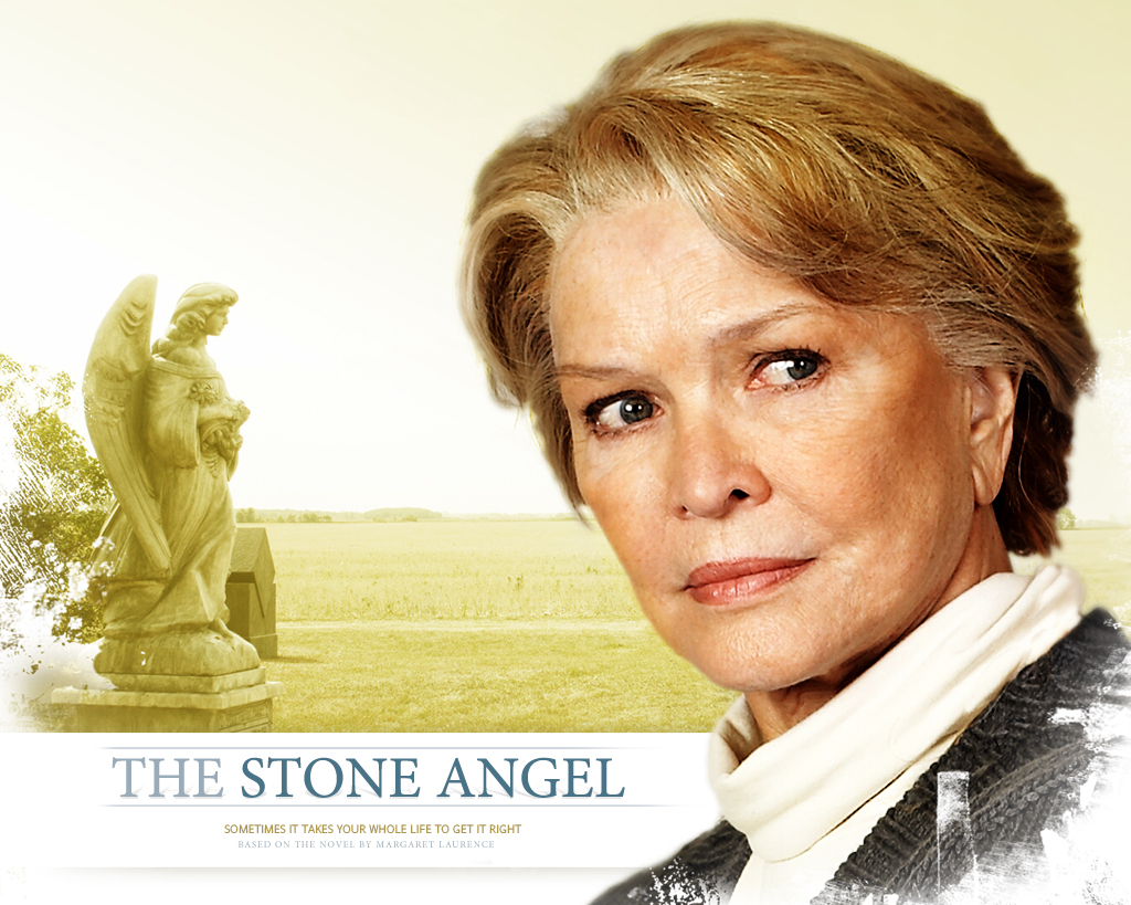 Description: A woman with a scarf around her neck and a statue in the background with a yellow sky in the background.