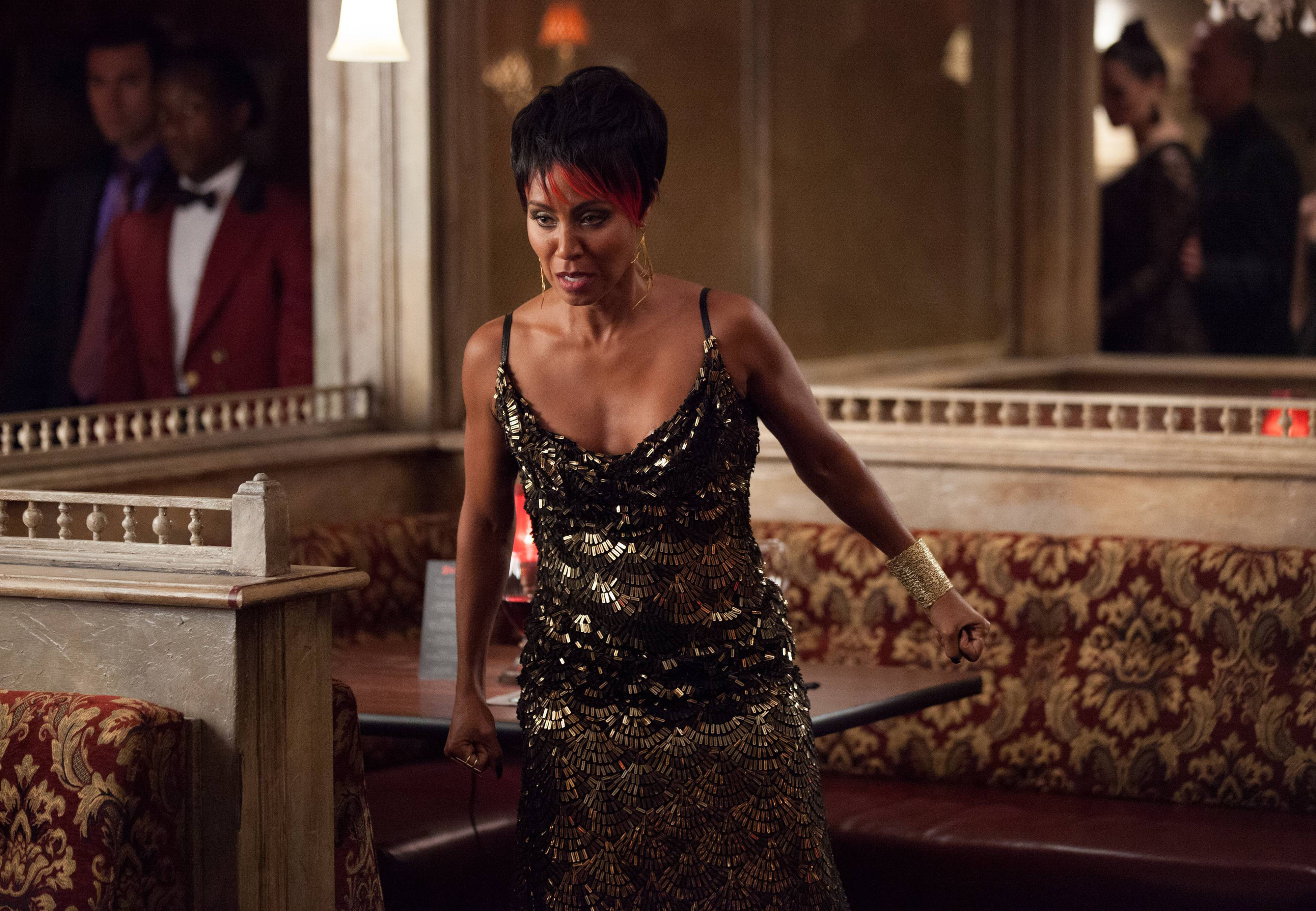Description: A woman in a sequin dress standing in a restaurant with a man in a red suit behind her.