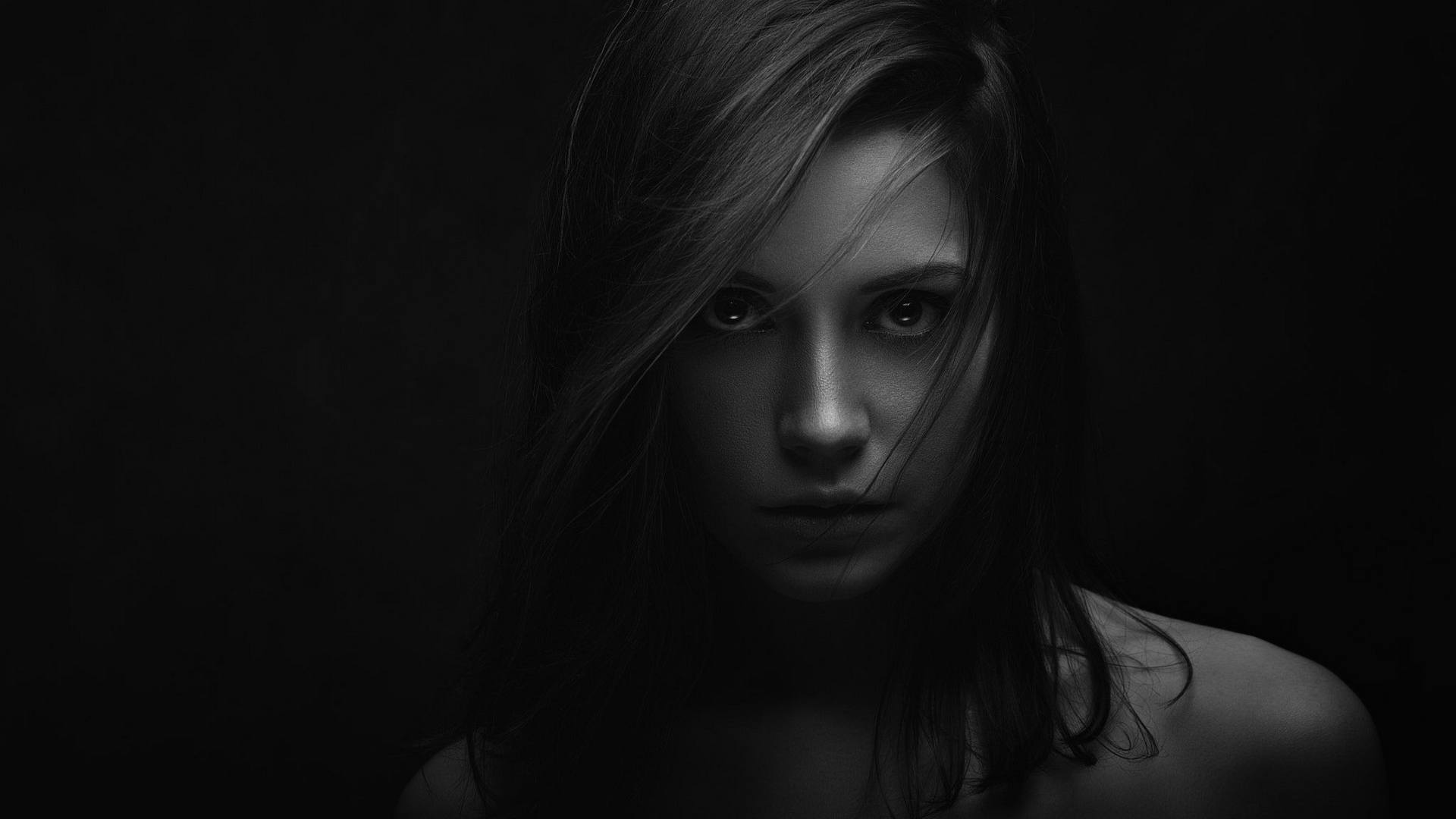 Description: A woman with a black background is looking at the camera with a serious look on her face and shoulders.