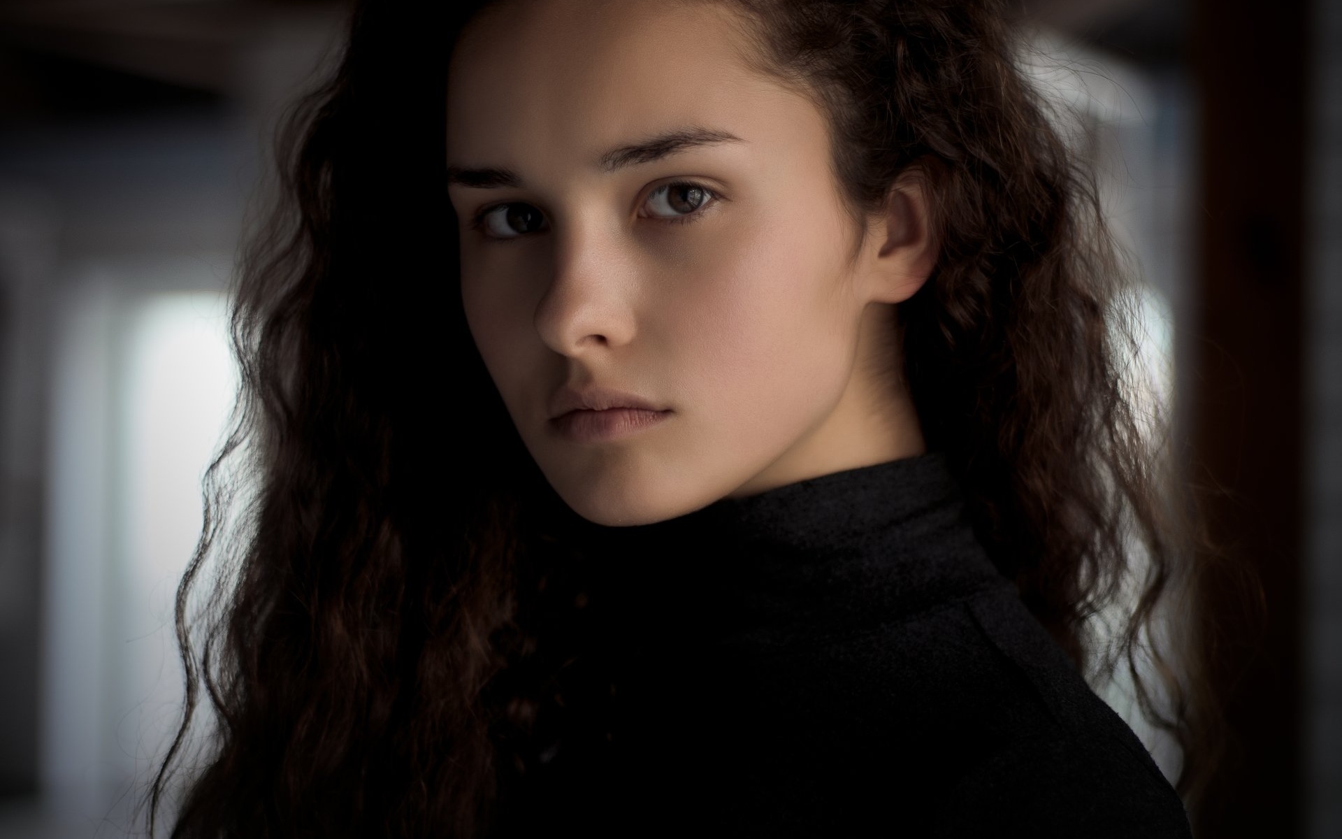 Description: A woman with long hair is looking at the camera with a serious look on her face and shoulder.