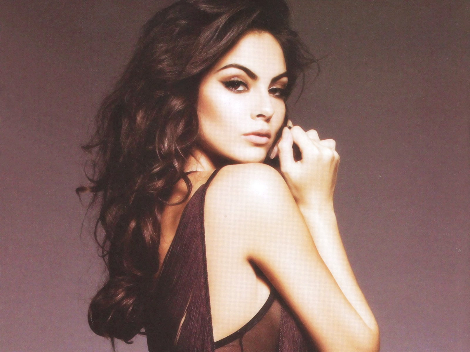 Description: A woman in a sheer dress posing for a picture with her hand on her cheek and her right arm on her chest.