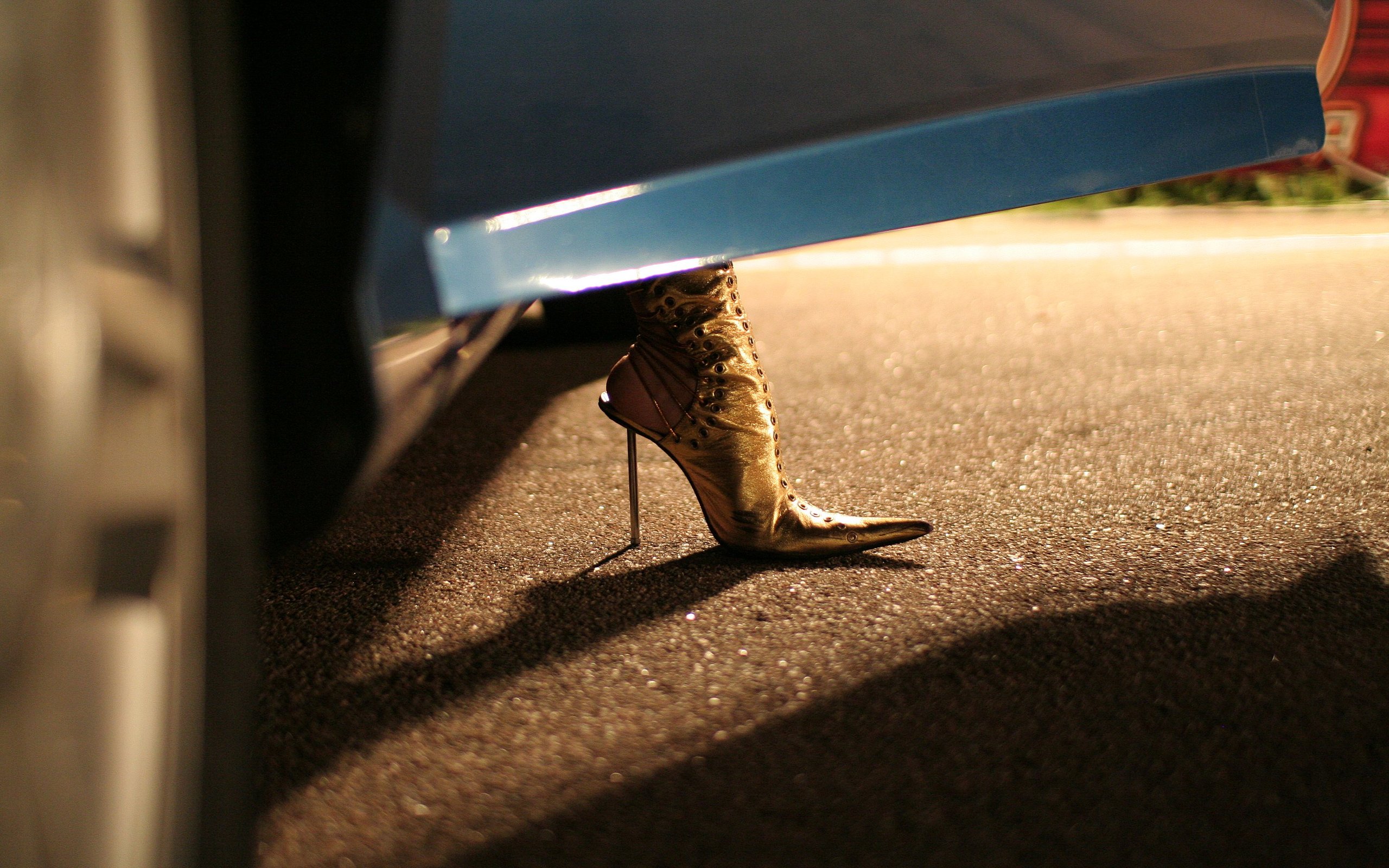 Description: A woman's high heeled shoes are seen from behind a vehicle door.