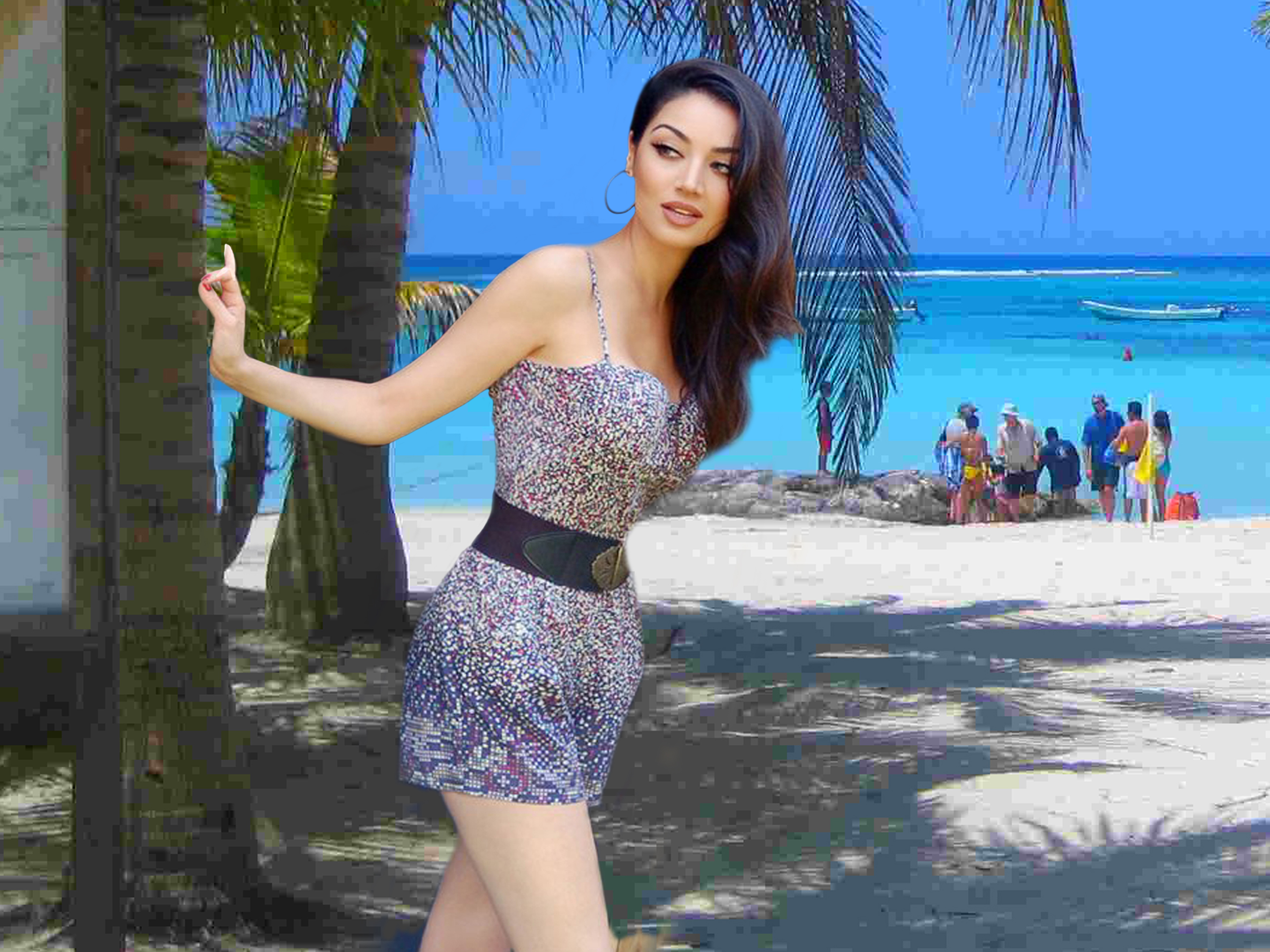 Description: A woman in a short dress is posing on the beach with a palm tree in the background and people in the water.