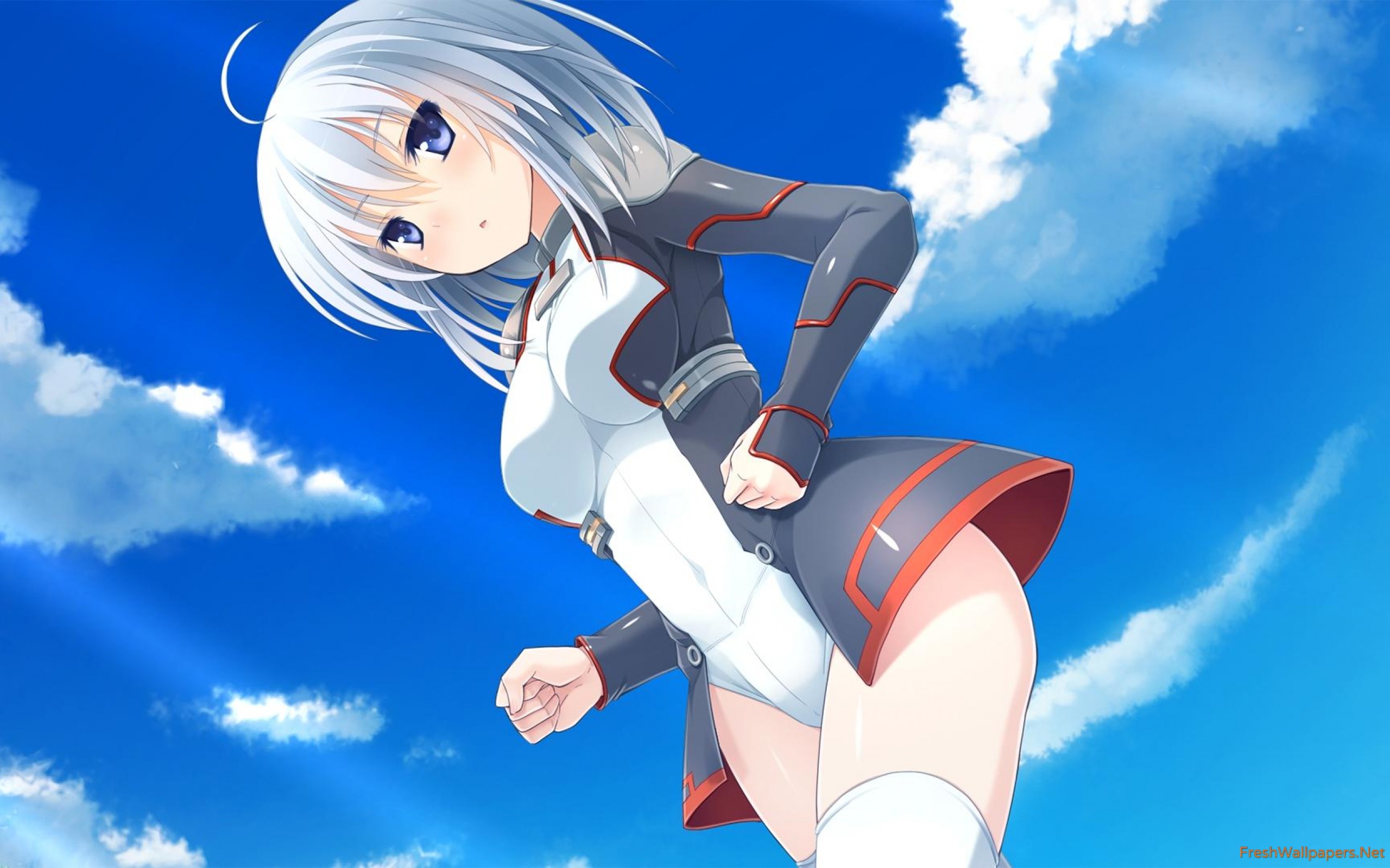 Description: A woman in a short skirt and boots flying through the air with her arms outstretched in the air.