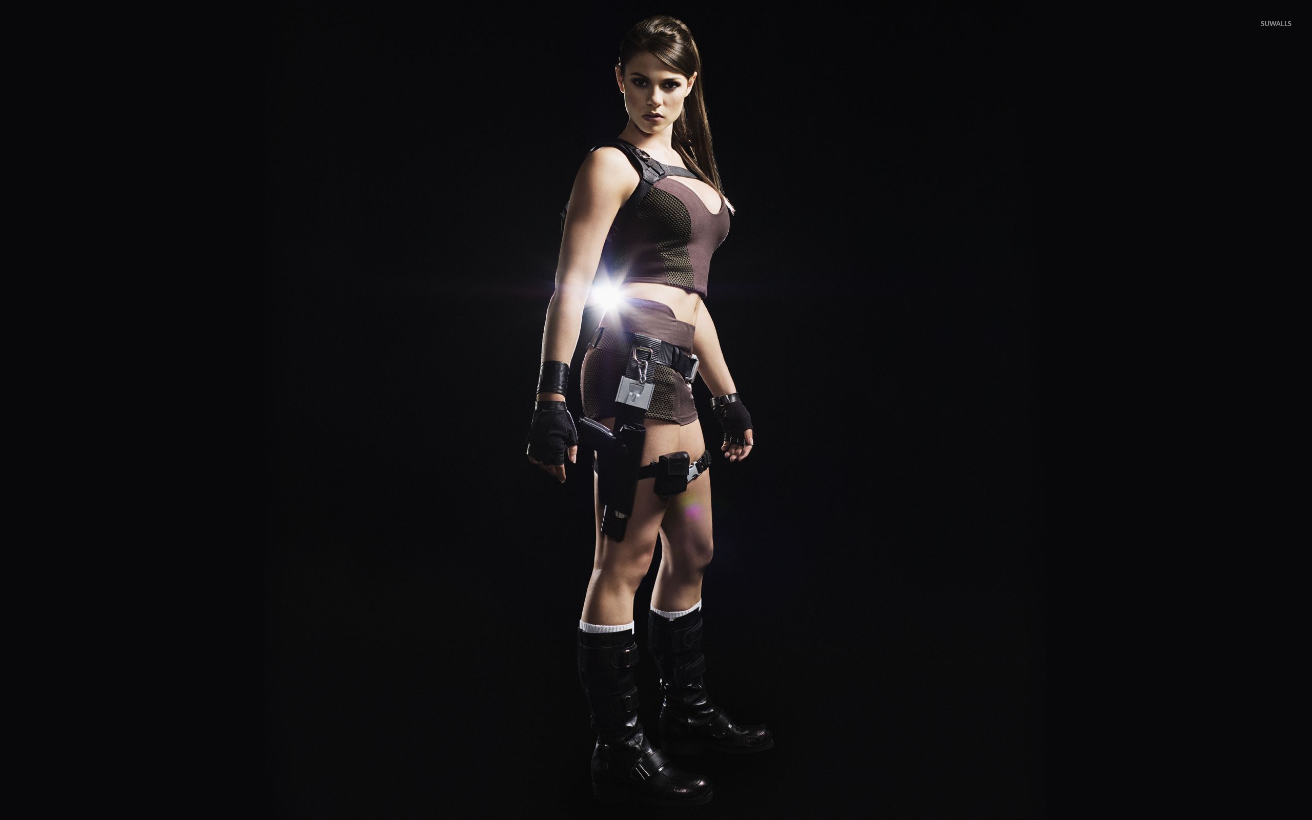 Description: A woman in a short skirt and knee pads standing in the dark with a light on her chest and arm.