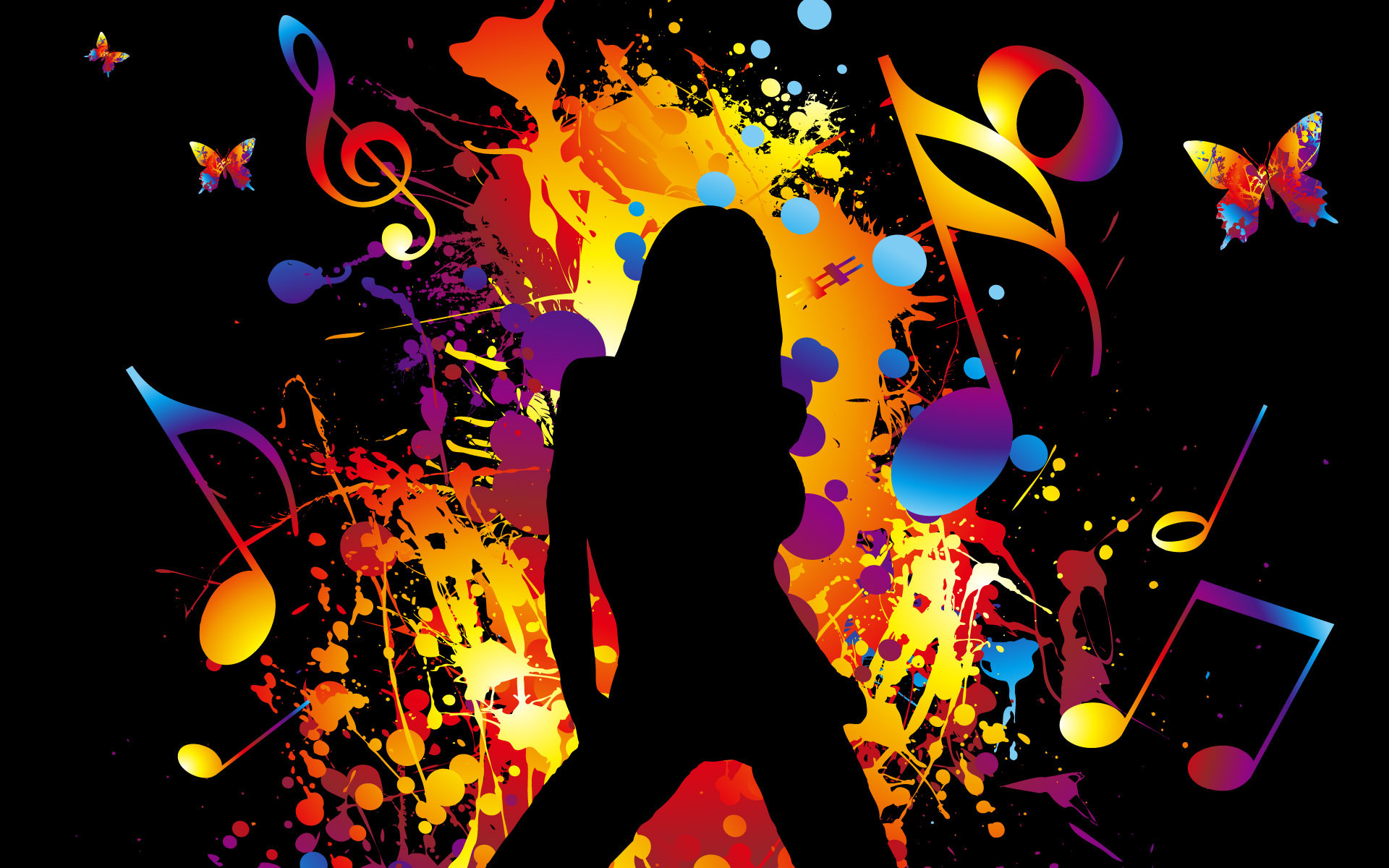 Description: A woman is silhouetted against a background of music notes and butterflies.