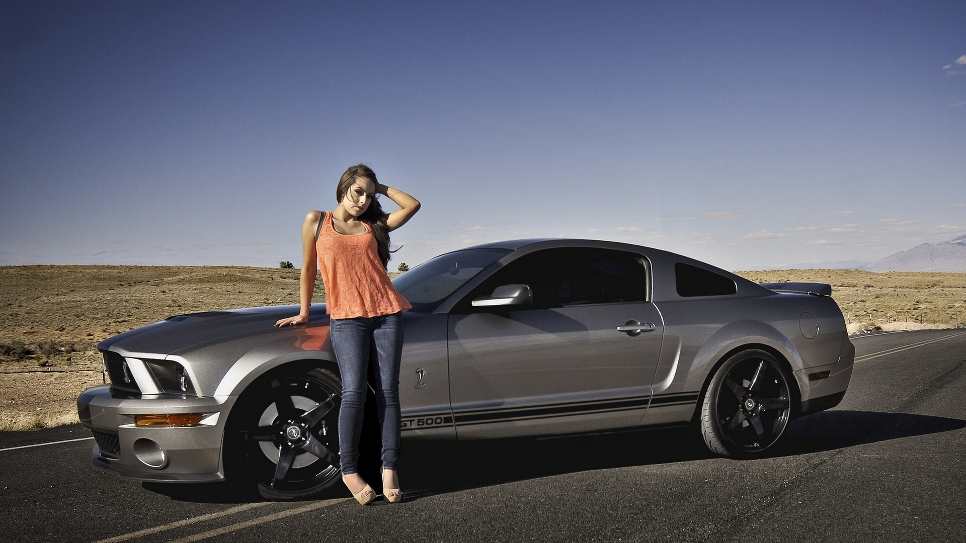 Description: A woman standing next to a silver car on a road with a sky background and a desert landscape behind her.