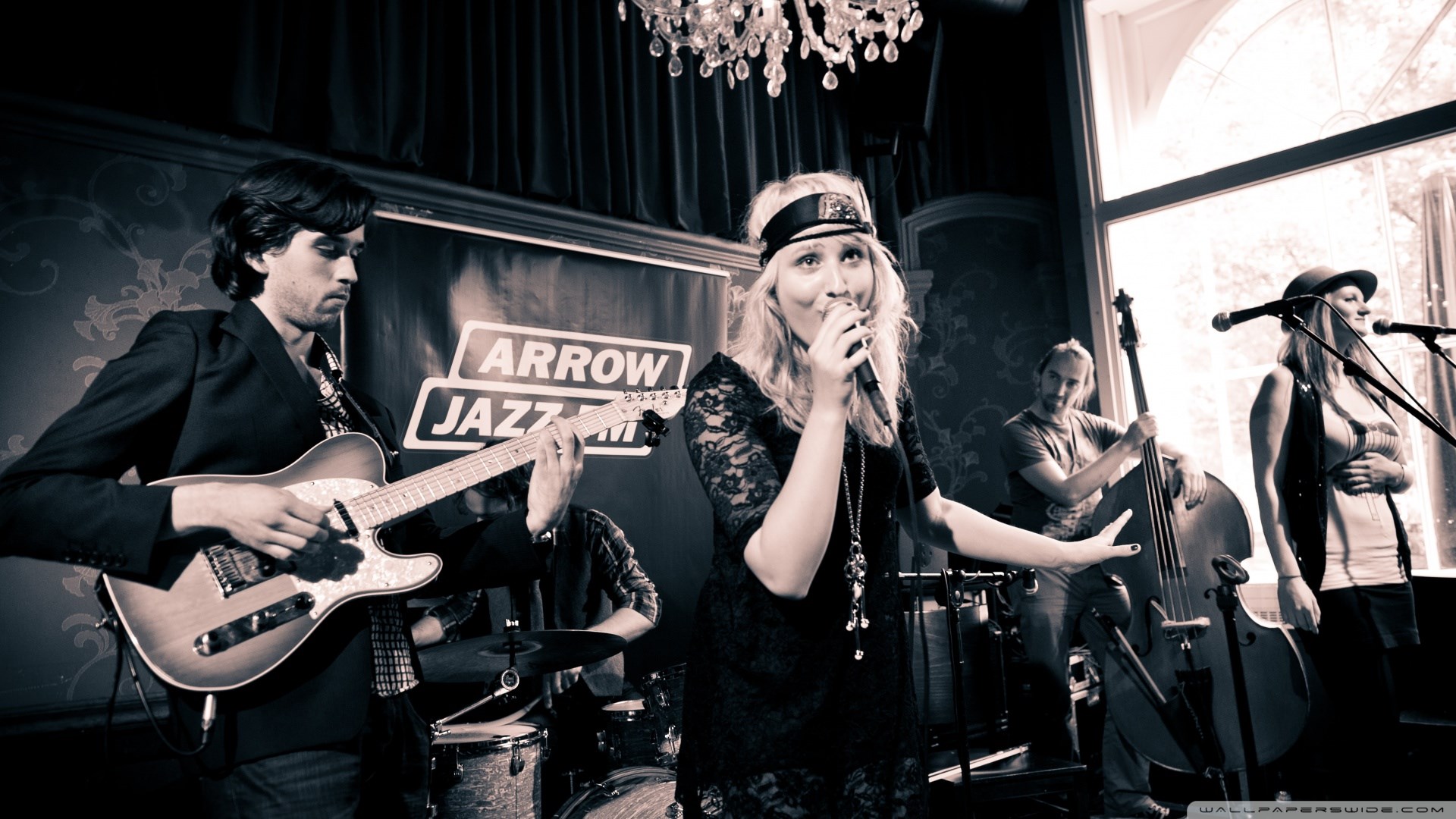 Description: A woman singing into a microphone while two men play guitar behind her on stage with a microphone and a microphone stand.